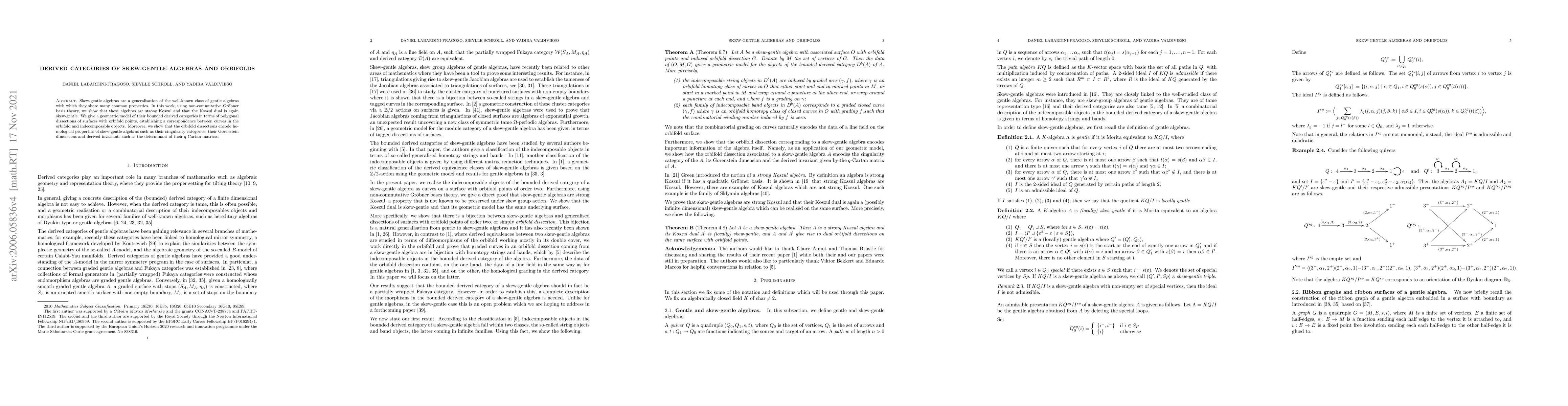 This research establishes that skew-gentle algebras are Koszul, with their Koszul dual also being skew-gentle. It geometrically models their derived categories via polygonal dissections of orbifold surfaces, linking curves in the orbifold to indecomposable objects and encoding important homological properties.