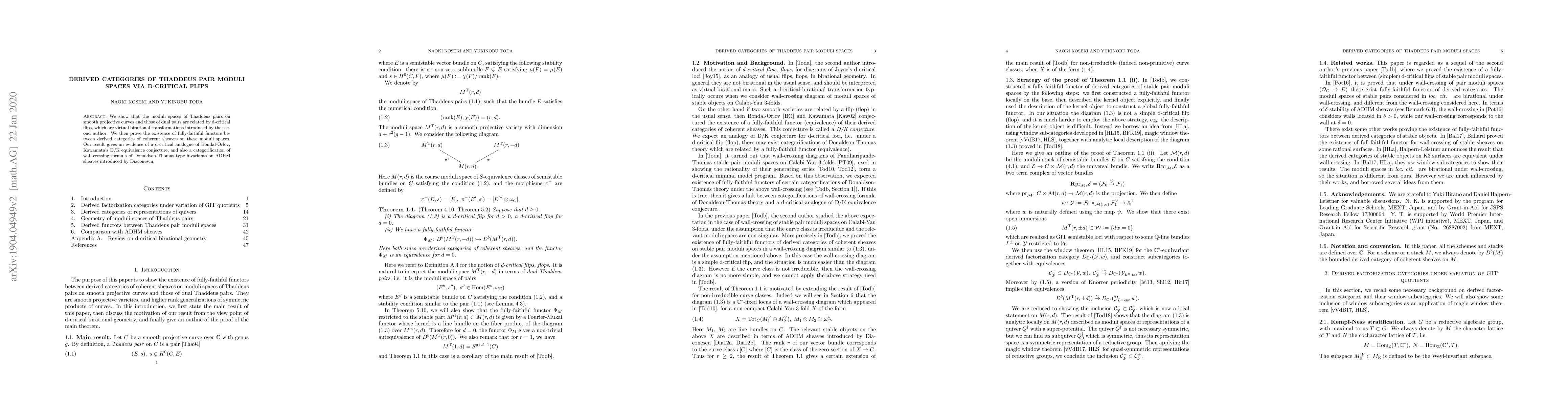 This paper establishes a connection between moduli spaces of Thaddeus pairs and dual pairs via d-critical flips, showing existence of fully-faithful functors between their derived categories, thus supporting a d-critical analogue of Bondal-Orlov conjecture and categorifying Donaldson-Thomas invariants.