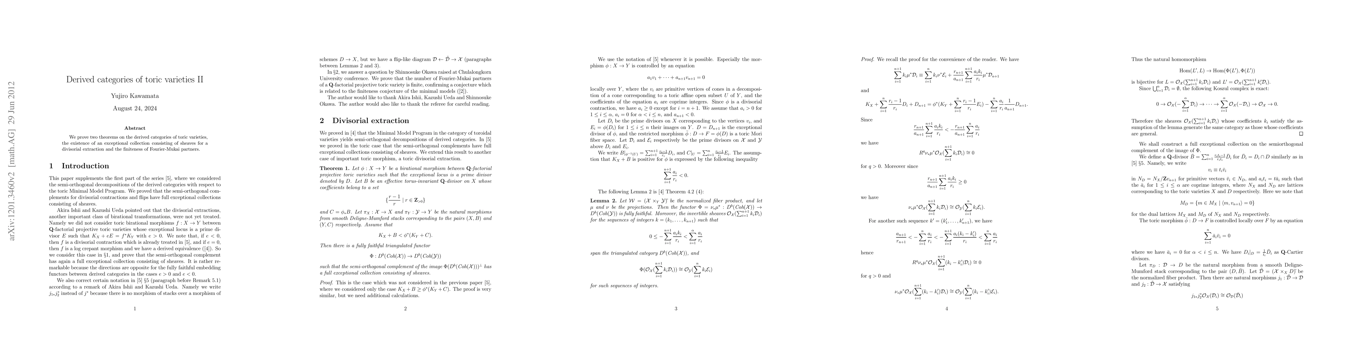 Summary: This paper presents two theorems regarding the derived categories of toric varieties: it establishes the existence of an exceptional collection of sheaves for divisorial extraction and proves the finiteness of Fourier-Mukai partners.