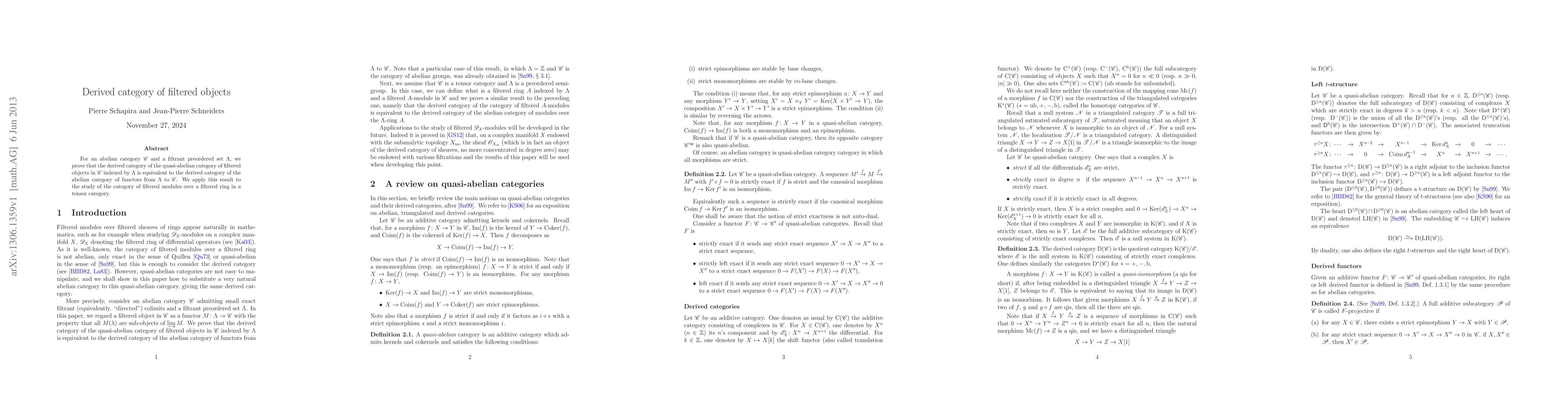 The paper establishes an equivalence between the derived category of filtered objects in an abelian category indexed by a filtrant preordered set and the derived category of functors from that set to the abelian category. This result is applied to filtered modules over filtered rings within a tensor category.