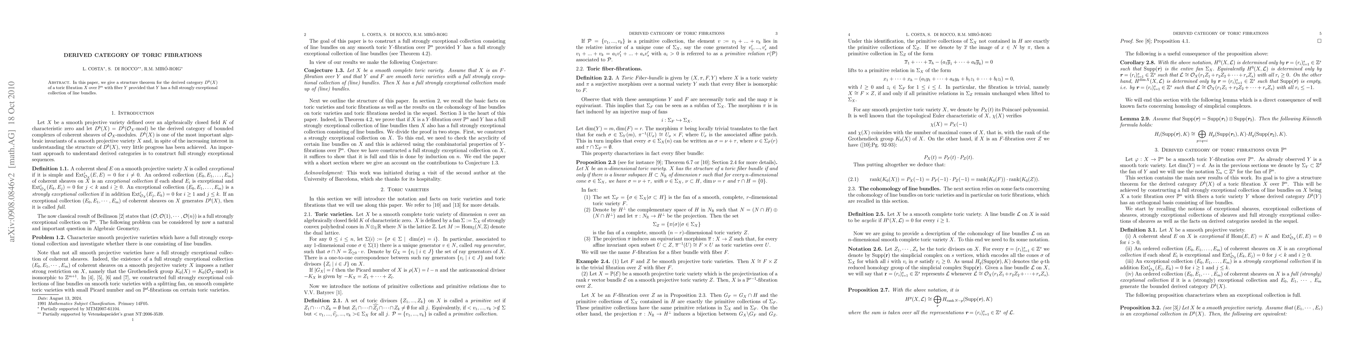 This paper presents a structure theorem for the derived category of toric fibrations when both the base and the fiber possess full strongly exceptional collections of line bundles, contributing to the understanding of derived categories in Algebraic Geometry.