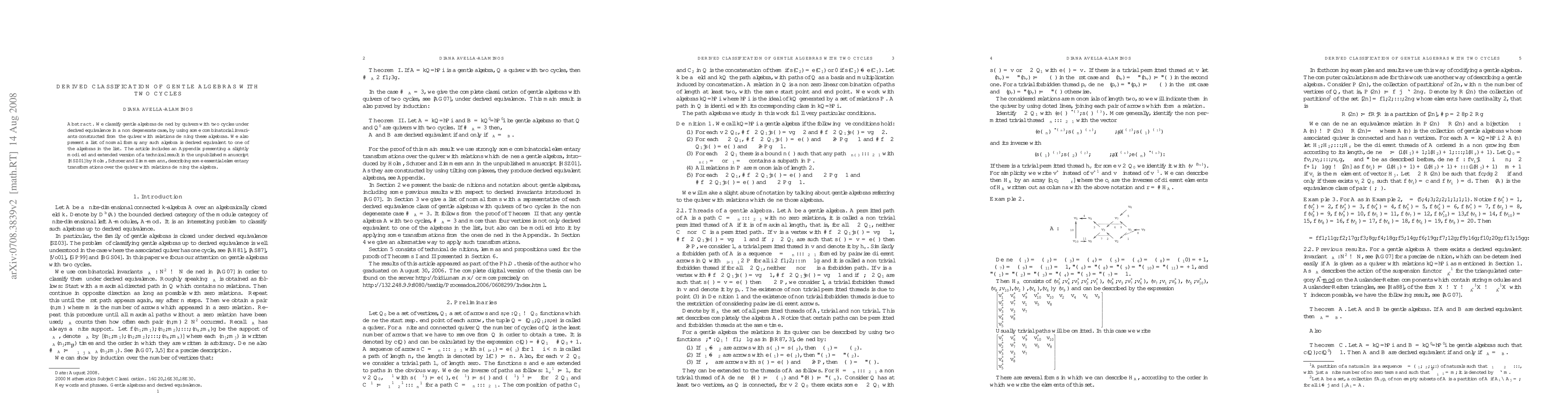 This paper classifies gentle algebras with two cycles under derived equivalence using combinatorial invariants derived from their defining quivers. It provides a list of normal forms, showing that any such algebra is derived equivalent to one in the list.