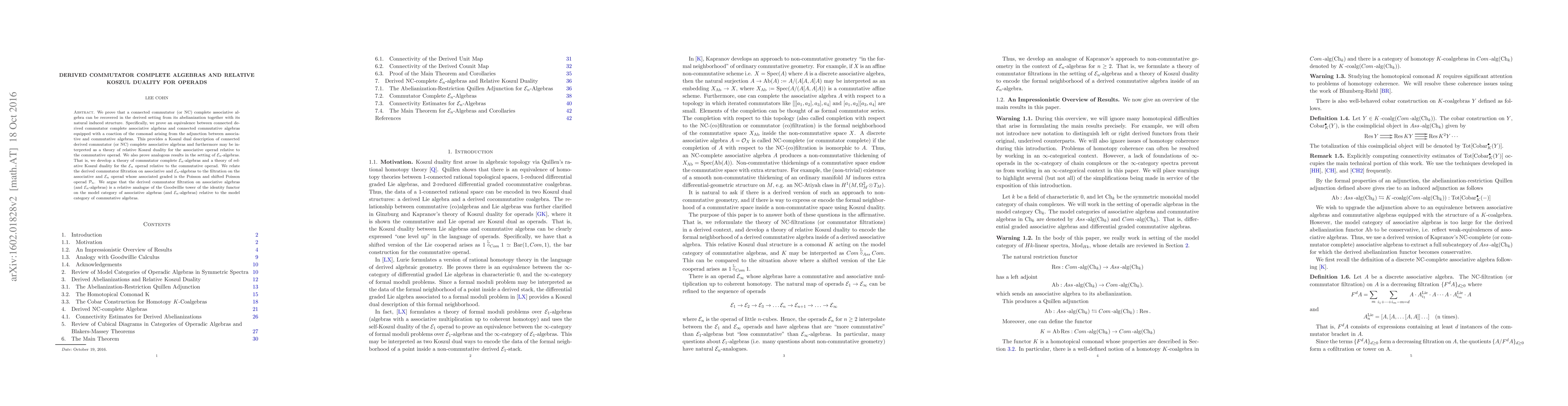 We prove that a connected commutator (or NC) complete associative algebra can be recovered in the derived setting from its abelianization together with its natural induced structure. Specifically, we prove an equivalence between connected derived commutator complete associative algebras and connected commutative algebras equipped with a coaction of the comonad arising from the adjunction between associative and commutative algebras. This provides a Koszul dual description of connected derived commutator (or NC) complete associative algebras and furthermore may be interpreted as a theory of relative Koszul duality for the associative operad relative to the commutative operad. We also prove analogous results in the setting of En-algebras. That is, we develop a theory of commutator complete En-algebras and a theory of relative Koszul duality for the En operad relative to the commutative operad. We relate the derived commutator filtration on associative and En-algebras to the filtration on the associative and En operad whose associated graded is the Poisson and shifted Poisson operad Pn. We argue that the derived commutator filtration on associative algebras (and En-algebras) are a relative analogue of the Goodwillie tower of the identity functor on the model category of associative algebras (and En-algebras) relative to the model category of commutative algebras.