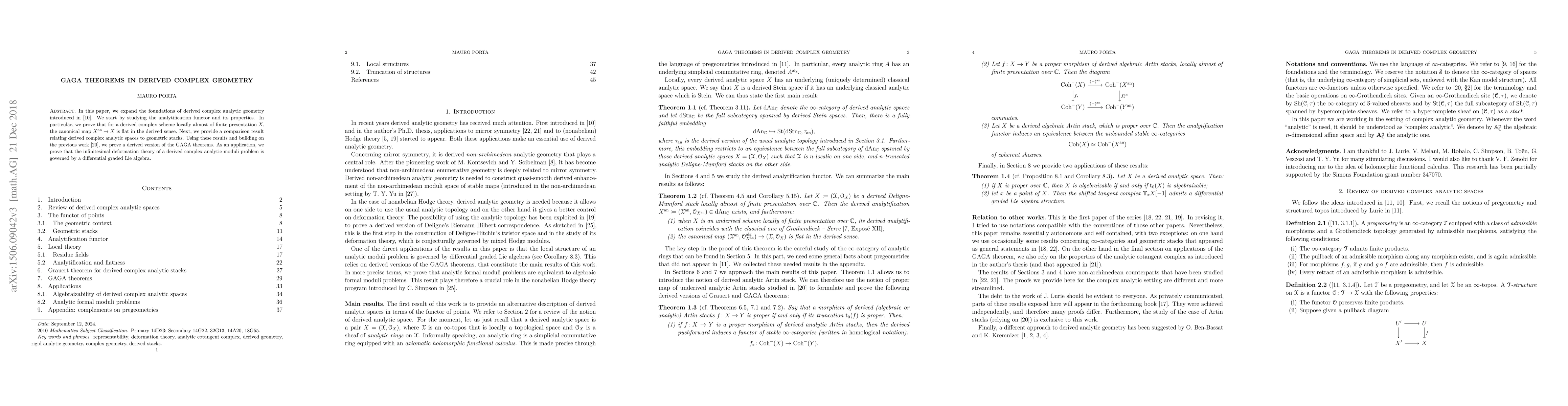 This paper extends the framework of derived complex analytic geometry, proving that the analytification functor is flat for derived schemes. It also establishes a derived version of the GAGA theorems and demonstrates that the infinitesimal deformation theory of moduli problems is controlled by a differential graded Lie algebra.