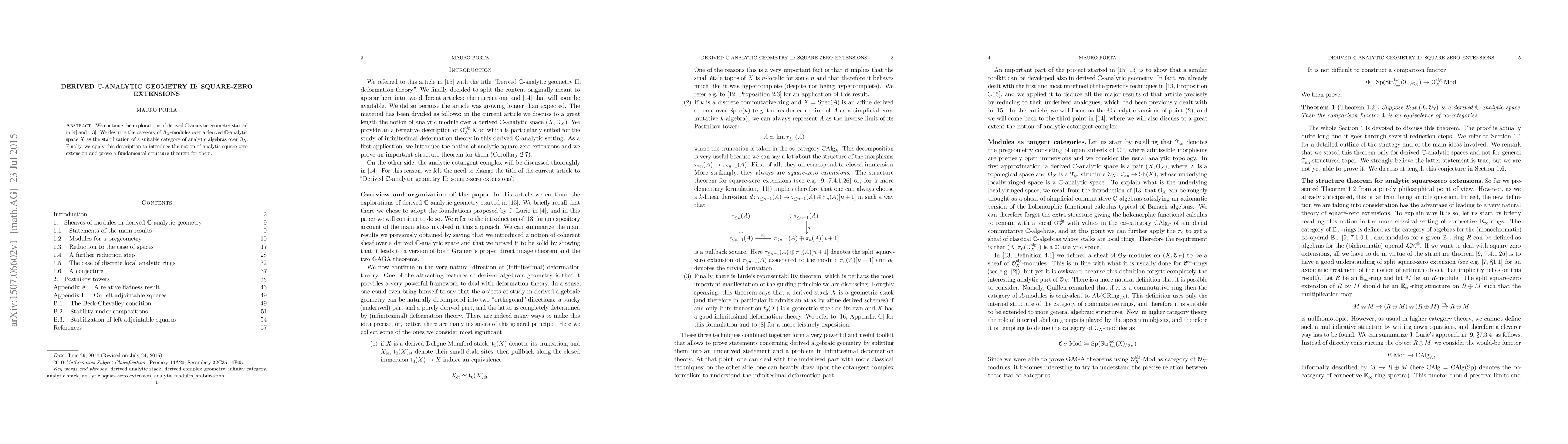 This paper extends the study of derived complex analytic geometry, focusing on the stabilization of $\mathcal O_X$-modules over derived complex analytic spaces. It introduces the concept of analytic square-zero extensions and proves a crucial structure theorem for these extensions.