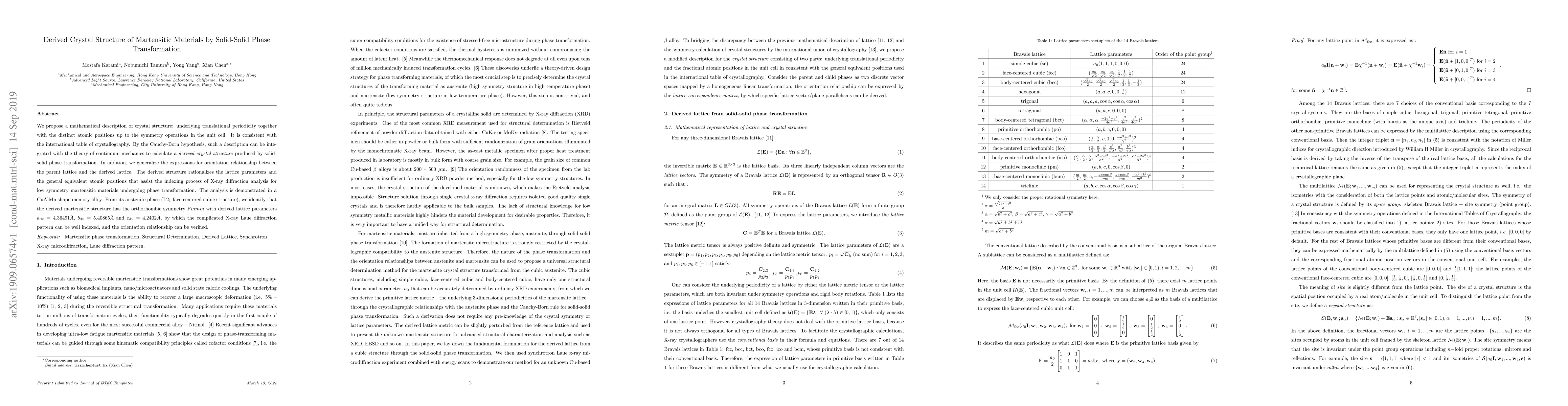 We propose a mathematical description of crystal structure: underlying translational periodicity together with the distinct atomic positions up to the symmetry operations in the unit cell. It is consistent with the international table of crystallography. By the Cauchy-Born hypothesis, such a description can be integrated with the theory of continuum mechanics to calculate a derived crystal structure produced by solid-solid phase transformation. In addition, we generalize the expressions for orientation relationship between the parent lattice and the derived lattice. The derived structure rationalizes the lattice parameters and the general equivalent atomic positions that assist the indexing process of X-ray diffraction analysis for low symmetry martensitic materials undergoing phase transformation. The analysis is demonstrated in a CuAlMn shape memory alloy. From its austenite phase (L2_1 face-centered cubic structure), we identify that the derived martensitic structure has the orthorhombic symmetry Pmmm with derived lattice parameters a_dv = 4.36491 \AA, b_dv = 5.40865 \AA and c_dv = 4.2402 \AA, by which the complicated X-ray Laue diffraction pattern can be well indexed, and the orientation relationship can be verified.
