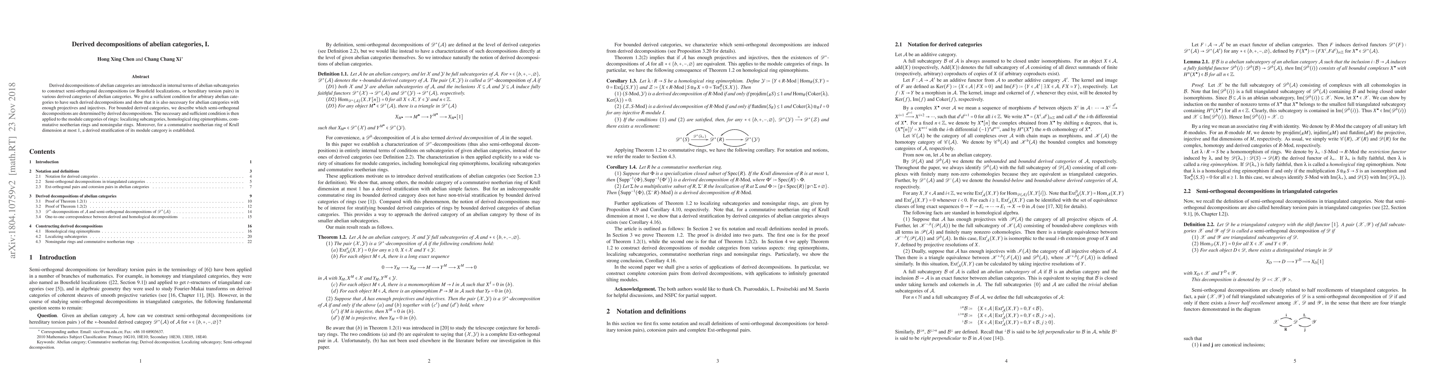 This paper introduces derived decompositions of abelian categories using internal abelian subcategories to construct semi-orthogonal decompositions in various derived categories. It provides a condition for arbitrary abelian categories to have these decompositions, proving necessity for categories with enough projectives and injectives, and applies this to module categories of rings, including commutative noetherian rings of dimension at most 1.