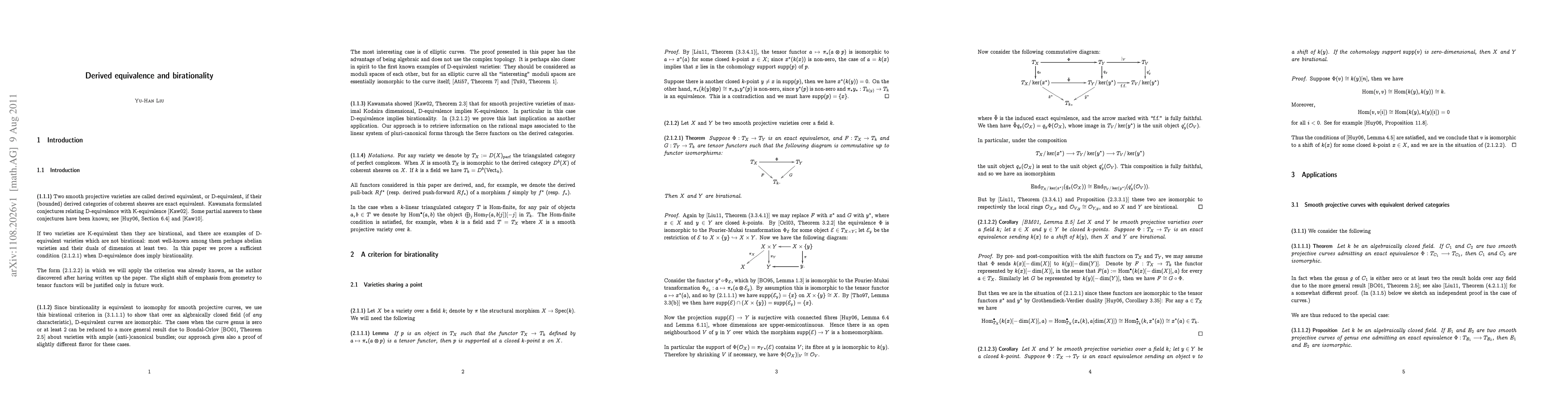 The paper provides a different proof for a known criterion of derived equivalence implying birationality, utilizing a commute diagram and properties of exact equivalences.
