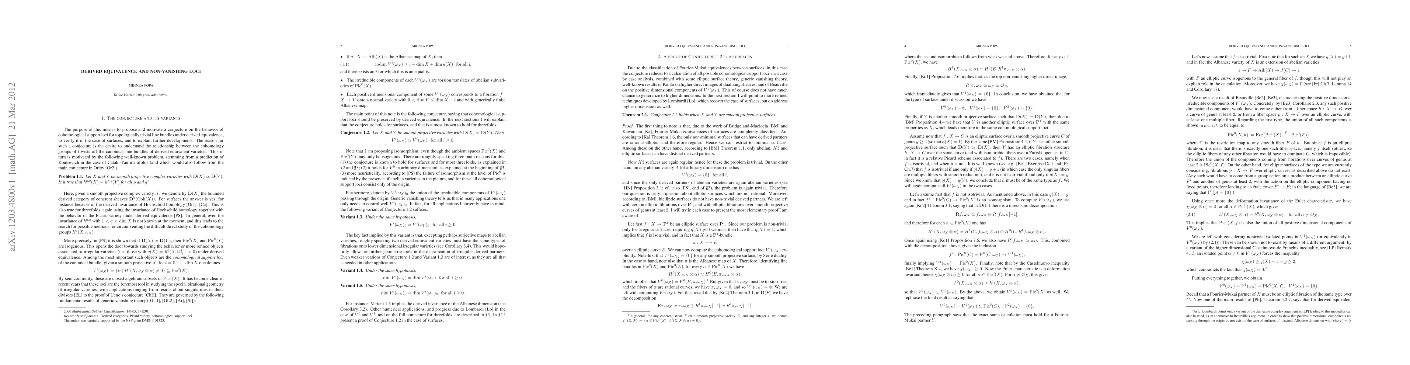The paper conjectures that cohomological support loci remain invariant under derived equivalence. It provides a proof for this conjecture in the specific case of surfaces and discusses potential future developments and implications.