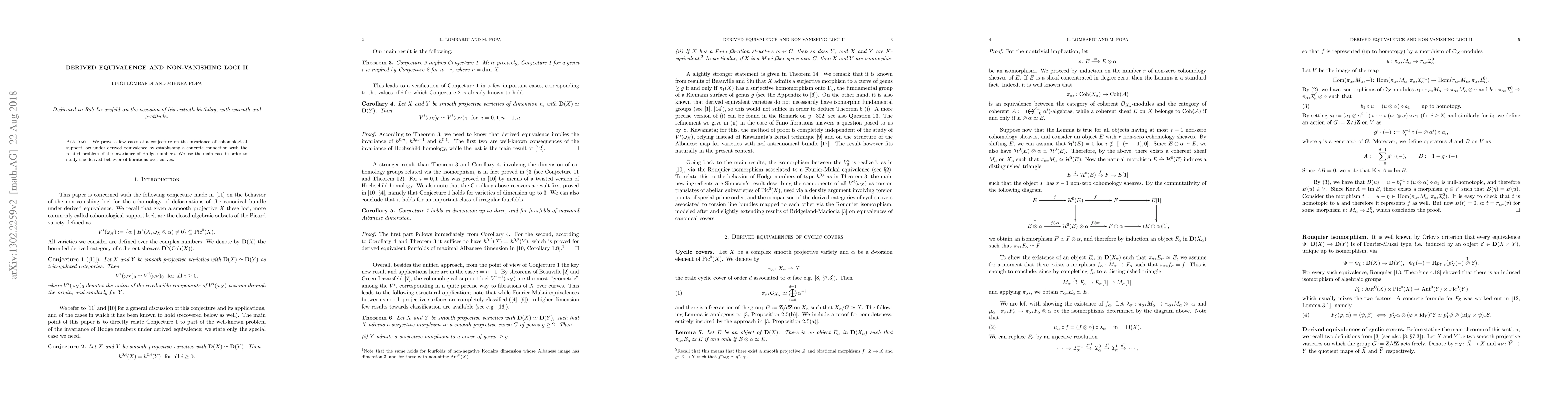 Summary: This paper proves specific instances of a conjecture on the invariance of cohomological support loci under derived equivalence, linking it to the invariance of Hodge numbers, and applies the findings to analyze the derived behavior of fibrations over curves.