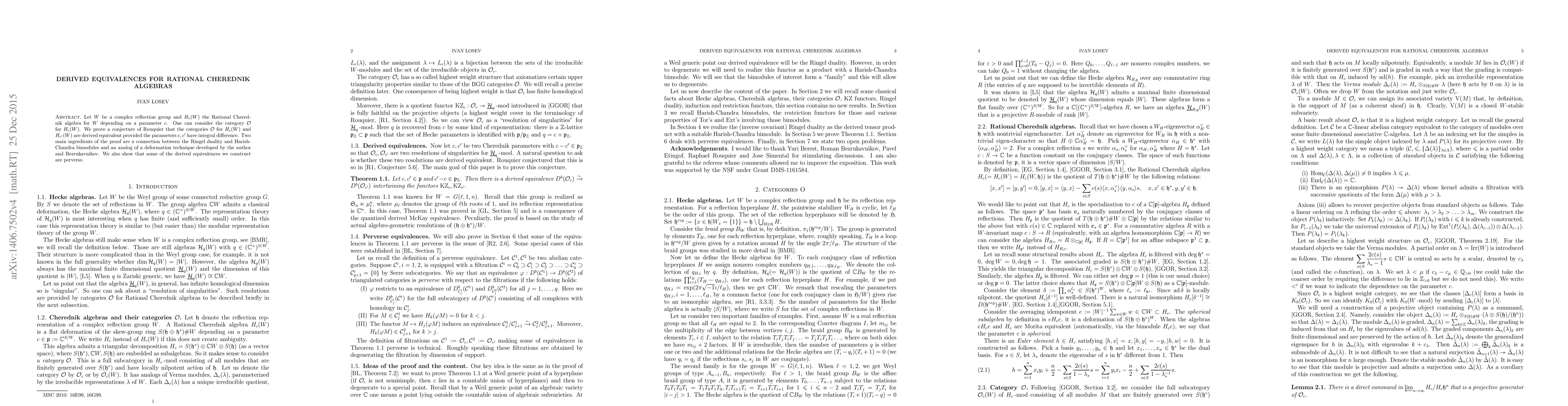 Summary: The paper proves Rouquier's conjecture on derived equivalences between categories O for Rational Cherednik algebras of a complex reflection group with differing parameters having integral differences, using Ringel duality and Harish-Chandra bimodules, and showing some equivalences are perverse.