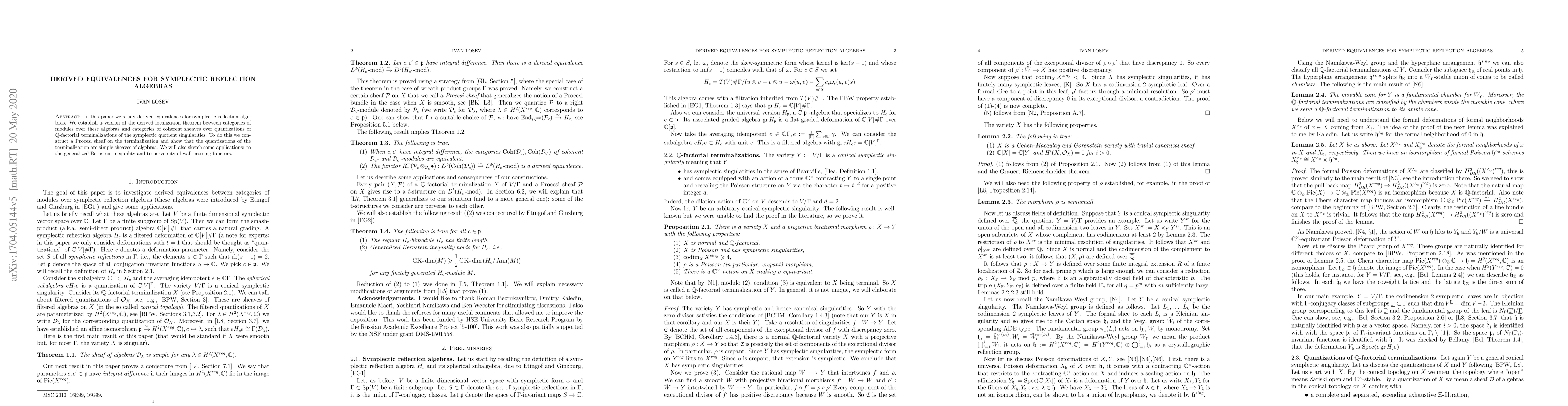 This paper establishes derived equivalences for Symplectic reflection algebras via a derived localization theorem, connecting module categories to coherent sheaves over quantizations of Q-factorial terminalizations of symplectic quotient singularities, using a constructed Procesi sheaf and simple sheaf algebras. Applications include the generalized Bernstein inequality and wall crossing functors.