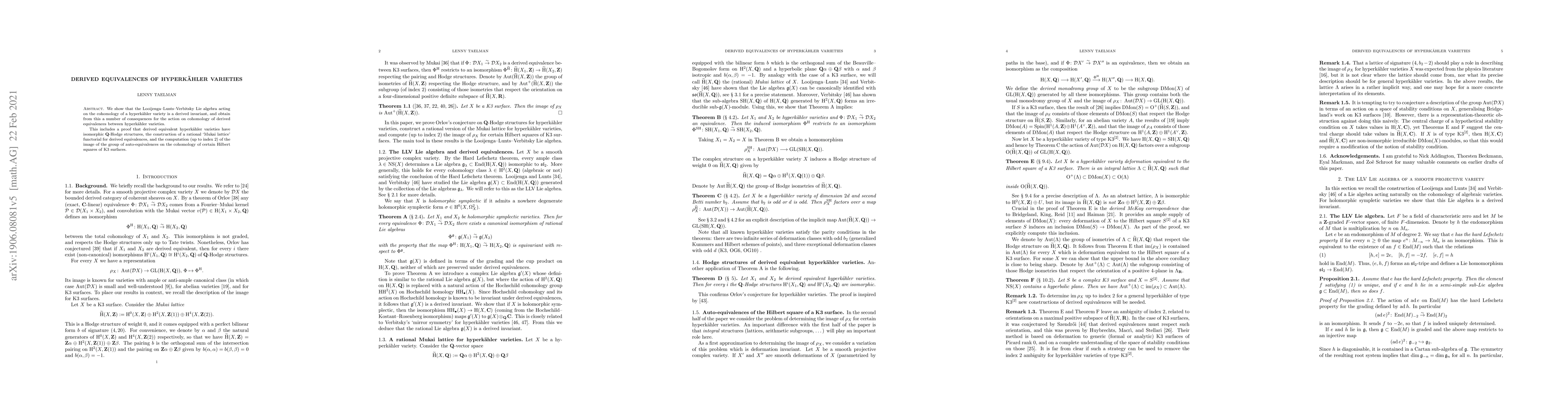 This paper demonstrates that the Looijenga-Lunts-Verbitsky Lie algebra is a derived invariant for hyperkähler varieties, leading to the conclusion that derived equivalent hyperkähler varieties share isomorphic $\mathbf{Q}$-Hodge structures and the construction of a functorial rational Mukai lattice. It also computes the auto-equivalences group image on the cohomology of certain Hilbert squares of K3 surfaces.