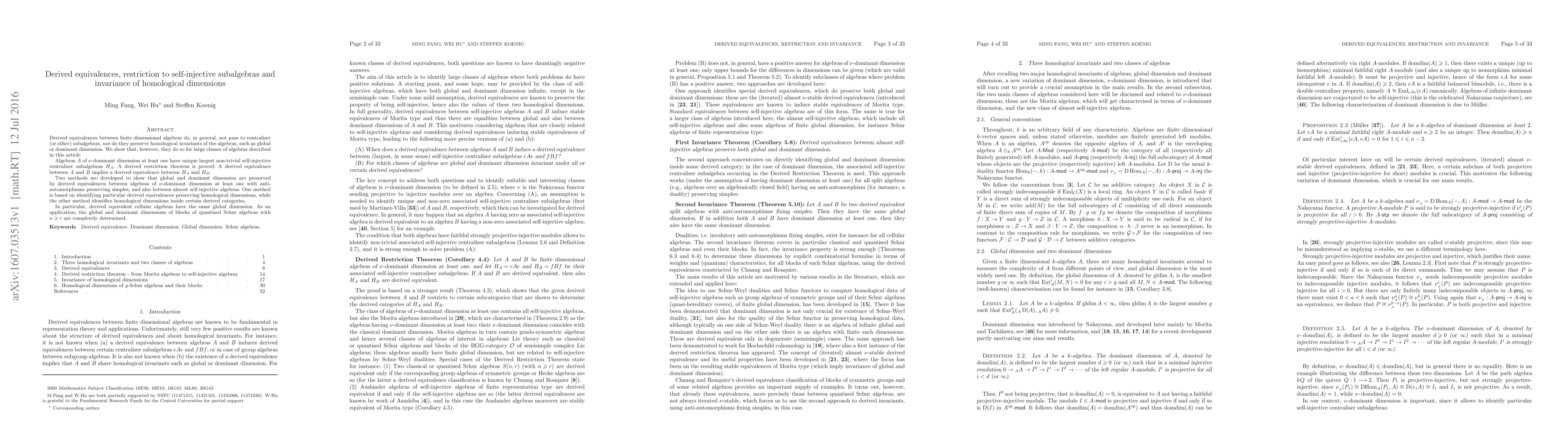 Derived equivalences between finite dimensional algebras do, in general, not pass to centraliser (or other) subalgebras, nor do they preserve homological invariants of the algebras, such as global or dominant dimension. We show that, however, they do so for large classes of algebras described in this article. Algebras $A$ of $\nu$-dominant dimension at least one have unique largest non-trivial self-injective centraliser subalgebras $H_A$. A derived restriction theorem is proved: A derived equivalence between $A$ and $B$ implies a derived equivalence between $H_A$ and $H_B$. Two methods are developed to show that global and dominant dimension are preserved by derived equivalences between algebras of $\nu$-dominant dimension at least one with anti-automorphisms preserving simples, and also between almost self-injective algebras. One method is based on identifying particular derived equivalences preserving homological dimensions, while the other method identifies homological dimensions inside certain derived categories. In particular, derived equivalent cellular algebras have the same global dimension. As an application, the global and dominant dimensions of blocks of quantised Schur algebras with $n \geq r$ are completely determined.