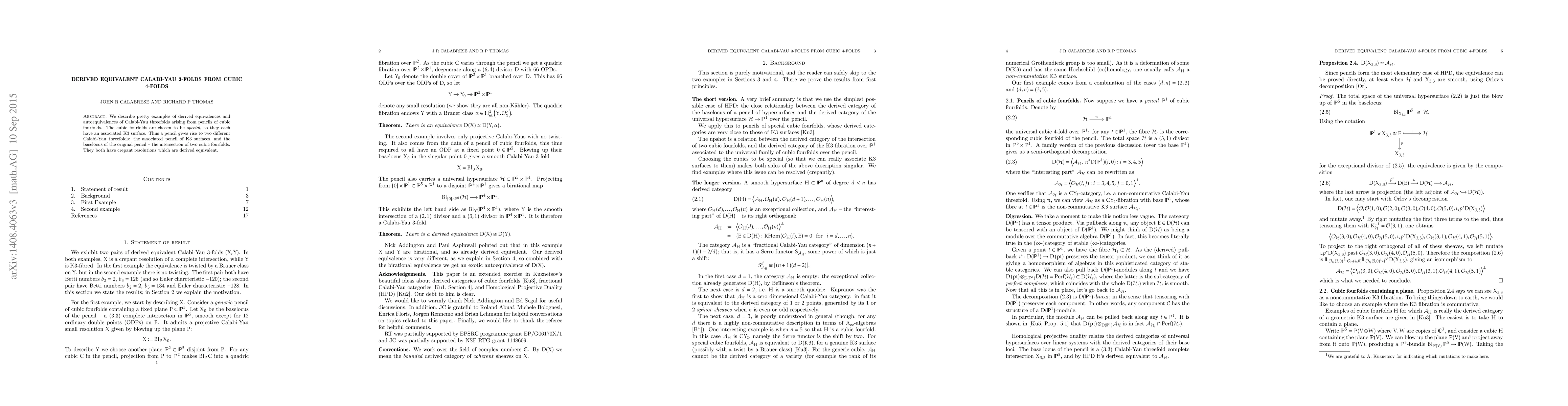 Researchers found that specific cubic fourfolds can give rise to two Calabi-Yau threefolds with crepant resolutions derived equivalent through a pencil of K3 surfaces.