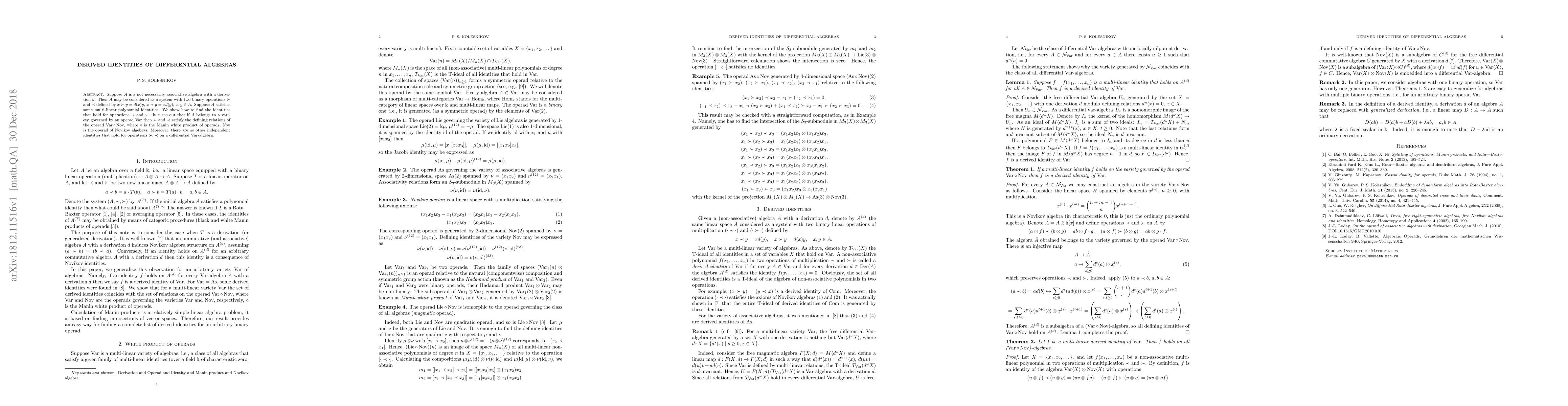 This paper explores identities in differential algebras with derivations, showing that if the algebra $A$ satisfies certain multi-linear polynomial identities, the operations $\succ$ and $\prec$ defined by the derivation satisfy the defining relations of the operad Var$\circ$Nov. It concludes that no additional identities hold for these operations beyond those dictated by this composition.