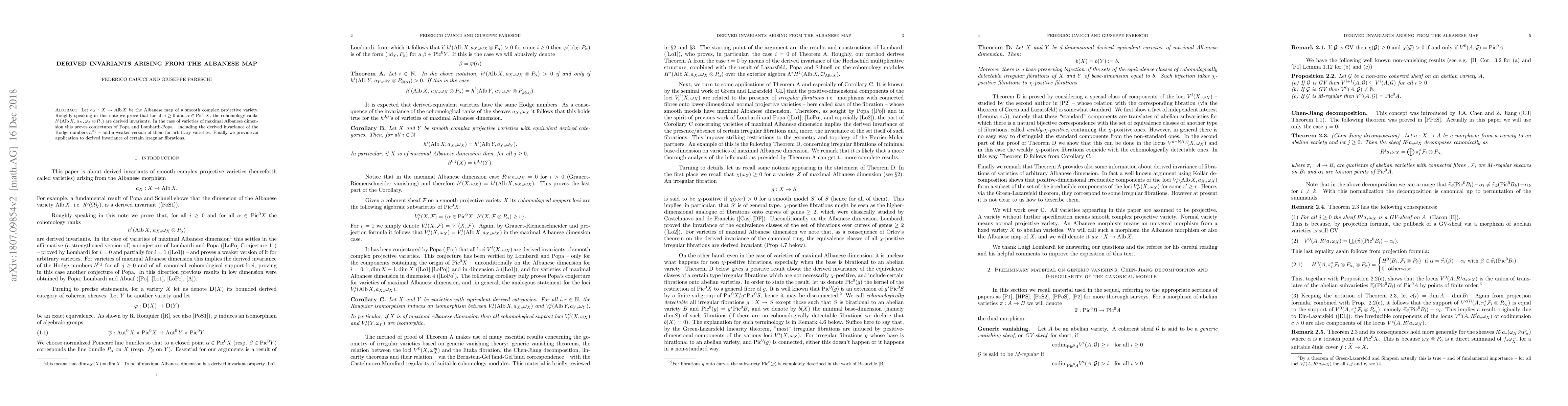 Let $a_X:X\rightarrow \mathrm{Alb}\, X$ be the Albanese map of a smooth complex projective variety. Roughly speaking in this note we prove that for all $i \geq 0$ and $\alpha\in \mathrm{Pic}^0\, X$, the cohomology ranks $h^i(\mathrm{Alb}\, X, \,{a_X}_* \omega_X\otimes P_\alpha)$ are derived invariants. In the case of varieties of maximal Albanese dimension this proves conjectures of Popa and Lombardi-Popa -including the derived invariance of the Hodge numbers $h^{0,j}$ -- and a weaker version of them for arbitrary varieties. Finally we provide an application to derived invariance of certain irregular fibrations.