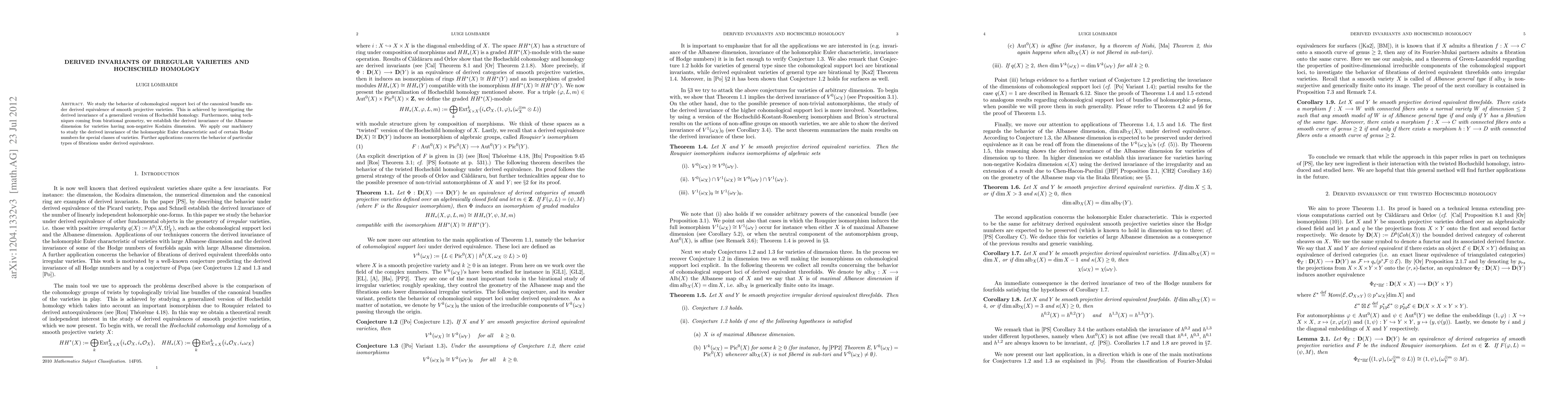 We study the behavior of cohomological support loci of the canonical bundle under derived equivalence of smooth projective varieties. This is achieved by investigating the derived invariance of a generalized version of Hochschild homology. Furthermore, using techniques coming from birational geometry, we establish the derived invariance of the Albanese dimension for varieties having non-negative Kodaira dimension. We apply our machinery to study the derived invariance of the holomorphic Euler characteristic and of certain Hodge numbers for special classes of varieties. Further applications concern the behavior of particular types of fibrations under derived equivalence.
