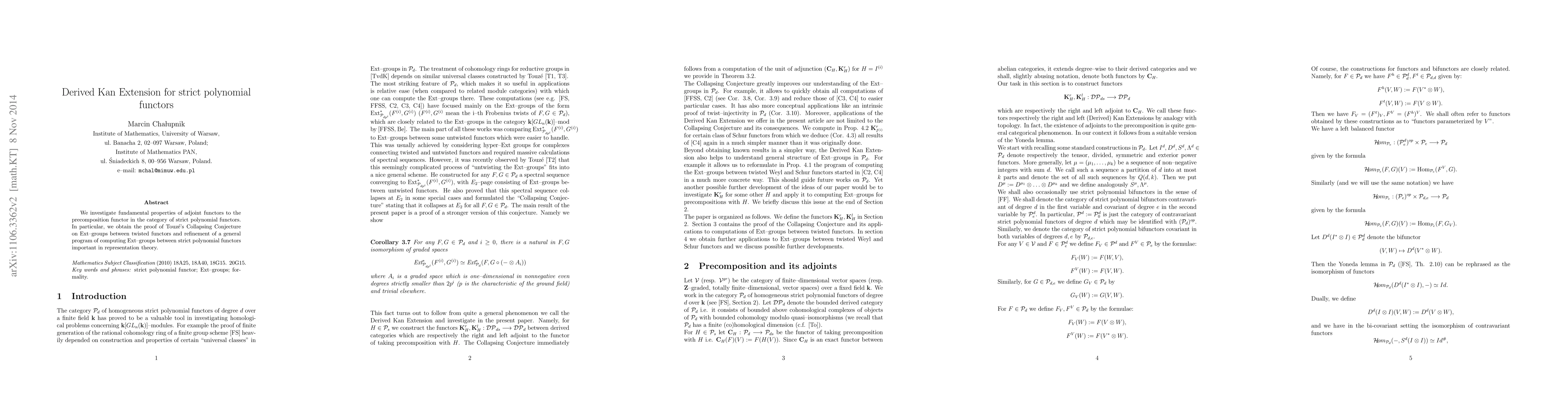 This paper explores the fundamental properties of adjoint functors associated with precomposition in the context of strict polynomial functors, aiming to understand their role and implications in category theory.