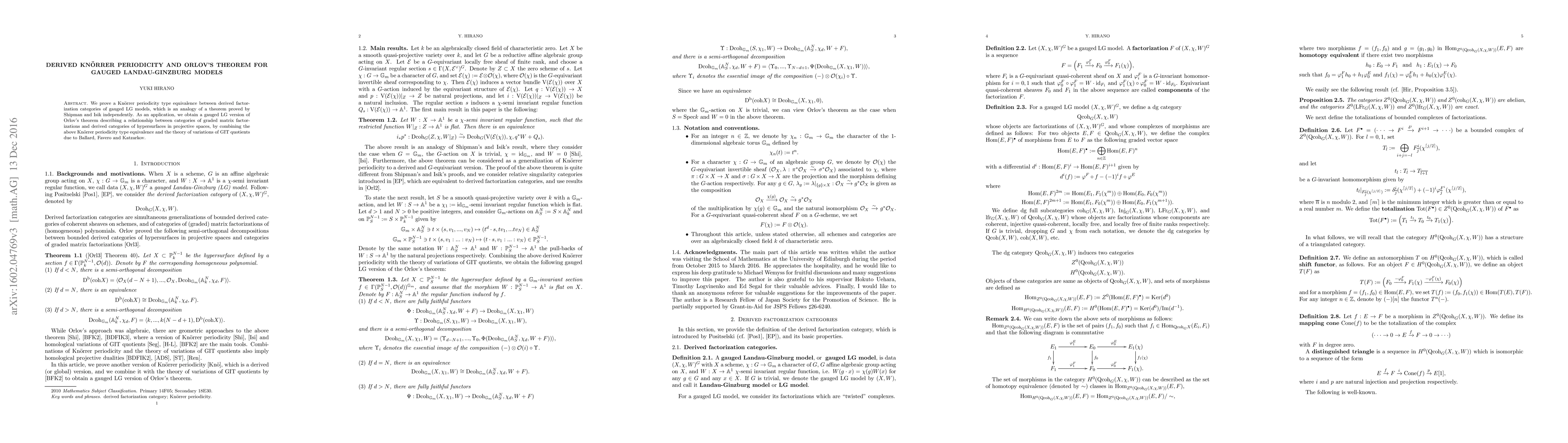 The paper establishes a Knörrer periodicity equivalence for derived factorization categories of gauged Landau-Ginzburg models and uses this to derive a gauged LG version of Orlov's theorem, linking matrix factorizations and derived categories of hypersurfaces in projective spaces.