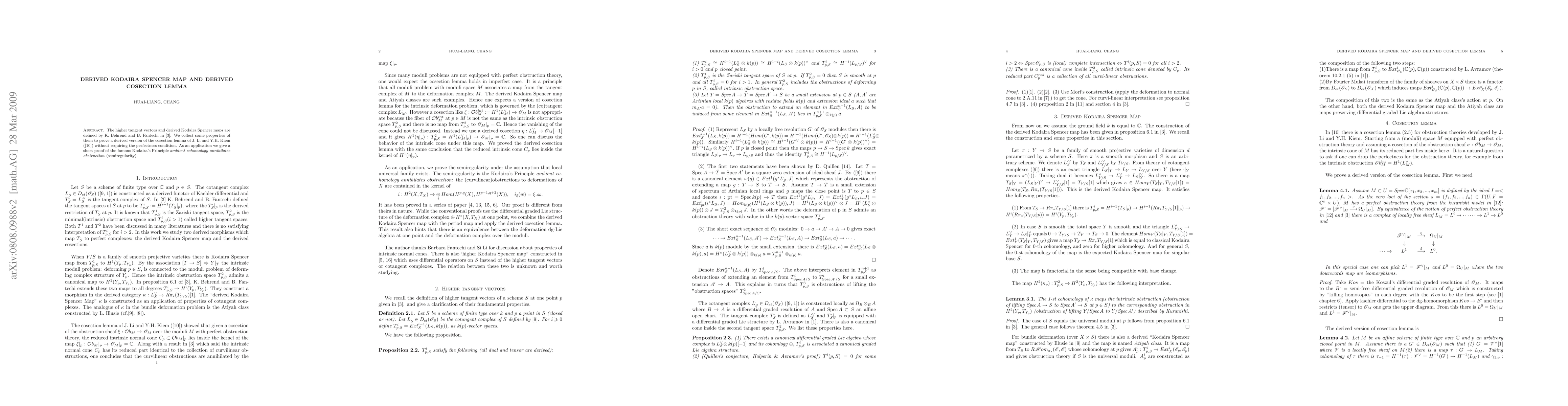 The cosection lemma proved by J. Li and Y.H. Kiem said the intrinsic normal cone lies inside the kernel of any cosection of the obstruction sheaf when the moduli has a perfect obstruction theory. With a definition of higher tangent vectors of a scheme at a point, and a construction of the derived Kodaira Spencer map by K. Behrend and B. Fantechi, we prove a derived version of cosection lemma without perfect obstruction theory condition. As an application we give a short proof of the Kodaira's Principle \textit{ambient cohomology annihilates obstruction} (semiregularity), assuming the existence of locall universal family.