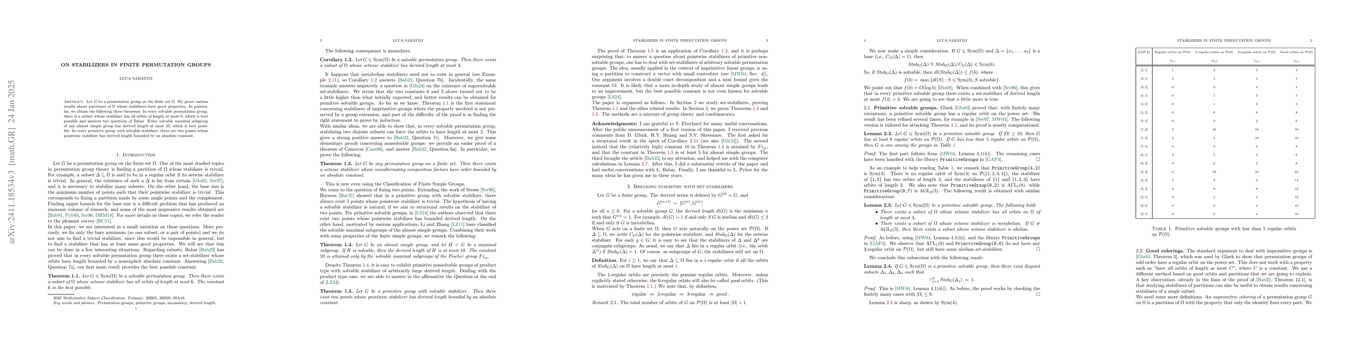 Let $G$ be a permutation group on the finite set $\Omega$. We study partitions of $\Omega$ whose stabilizers have bounded derived length, proving the following three theorems. In every solvable permutation group, there is a subset whose setwise stabilizer has derived length at most $3$, which is best possible. Every solvable maximal subgroup of any almost simple group has derived length bounded by an absolute constant. In every primitive group with solvable stabilizer, there are two points whose pointwise stabilizer has derived length bounded by an absolute constant.