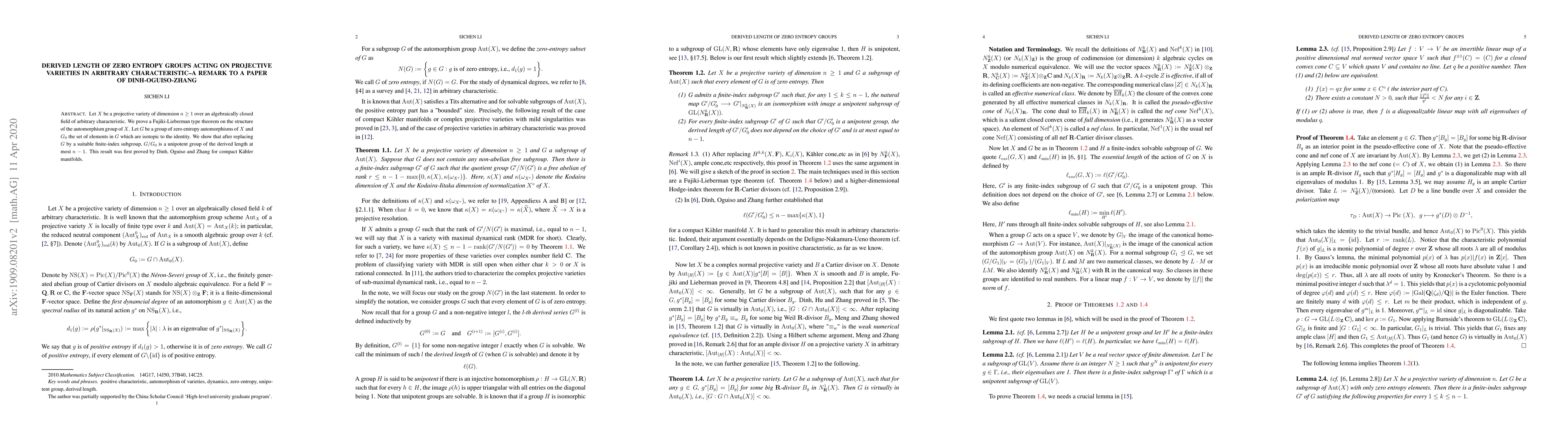 Summary: The paper proves a Fujiki-Lieberman theorem for automorphism groups of projective varieties in arbitrary characteristic, showing that a zero entropy automorphism group, after a finite-index subgroup replacement, has a derived length of at most $n-1$, extending previous results for compact Kähler manifolds.