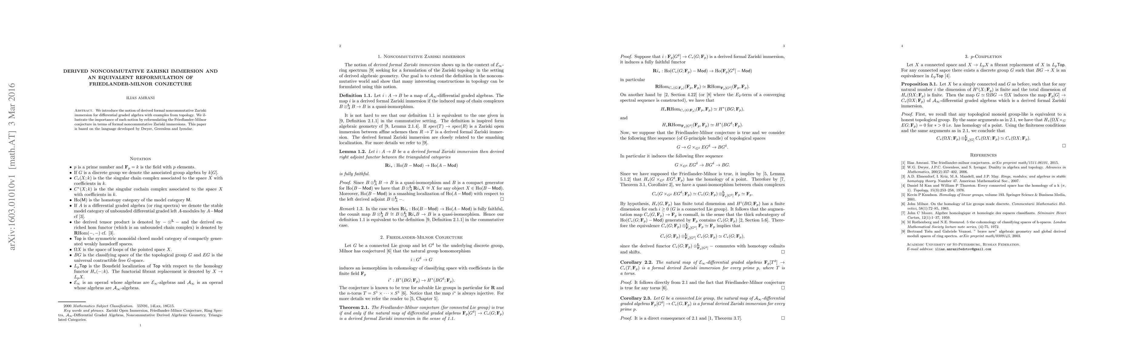 WeintroducethenotionofderivedformalnoncommutativeZariski immersion for differential graded algebra with examples from topology. We il- lustrate the importance of such notion by reformulating the Friedlander-Milnor conjecture in terms of formal noncommutative Zariski immersions. This paper is based on the language developed by Dwyer, Greenless and Iyendar.