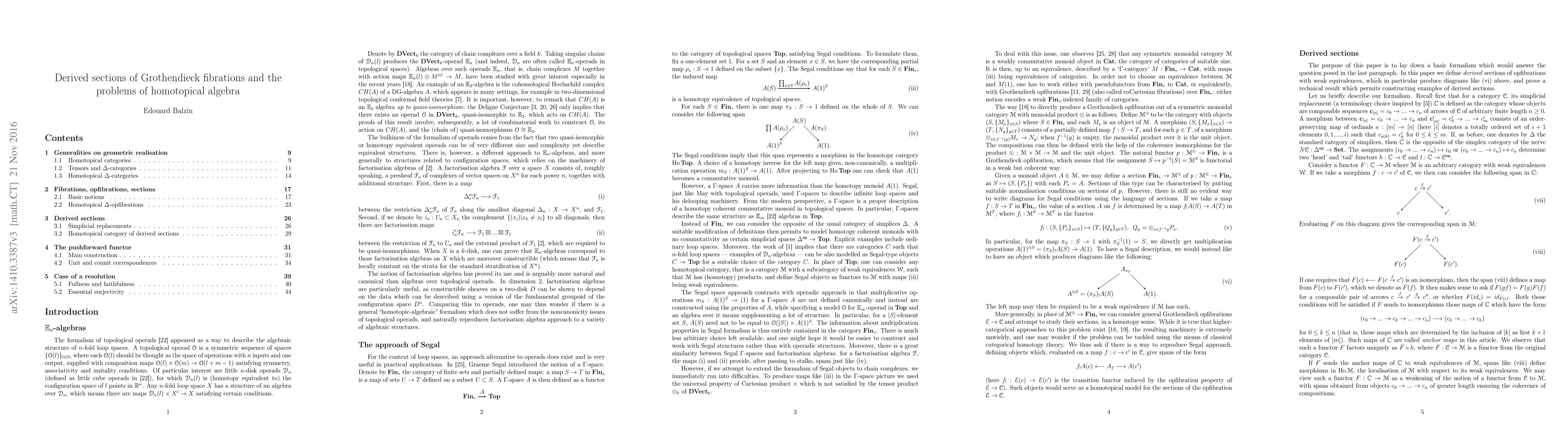 This paper explores the algebraic structures of n-fold loop spaces through topological operads and derived sections of Grothendieck fibrations. It proposes a model called derived sections for weak sections of homotopical fibrations and demonstrates their behavior under base change functors, proving the inverse image functor for specific resolutions is homotopically full and faithful.