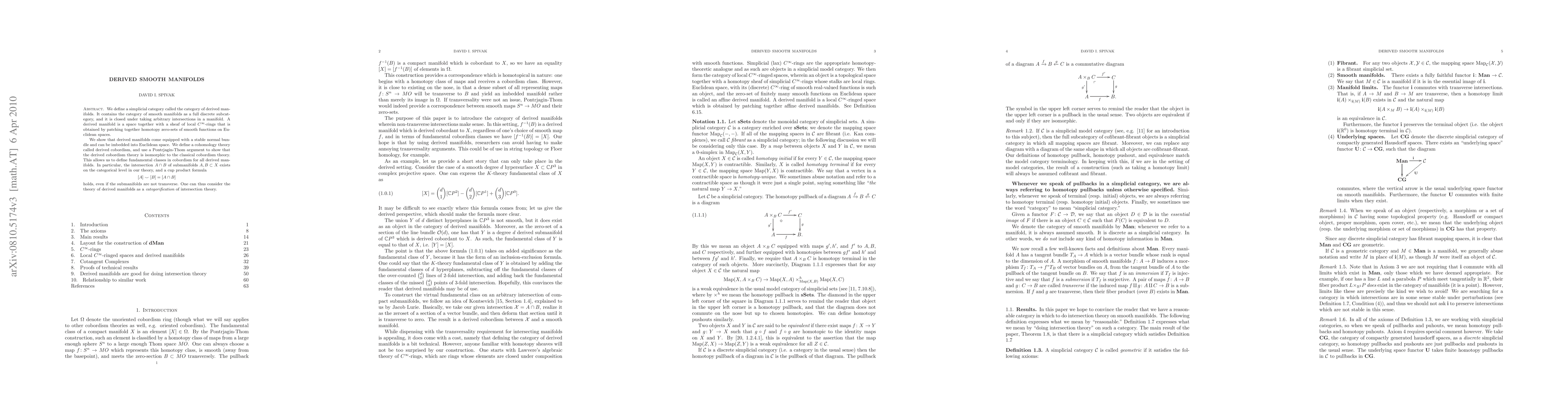 This paper introduces derived manifolds as simplicial objects in a category containing smooth manifolds, characterized by sheaves of local $C^\infty$-rings. It establishes a stable normal bundle, embeddability in Euclidean space, and a derived cobordism theory isomorphic to classical cobordism, allowing for intersection theory categorification, including non-transverse submanifold intersections.
