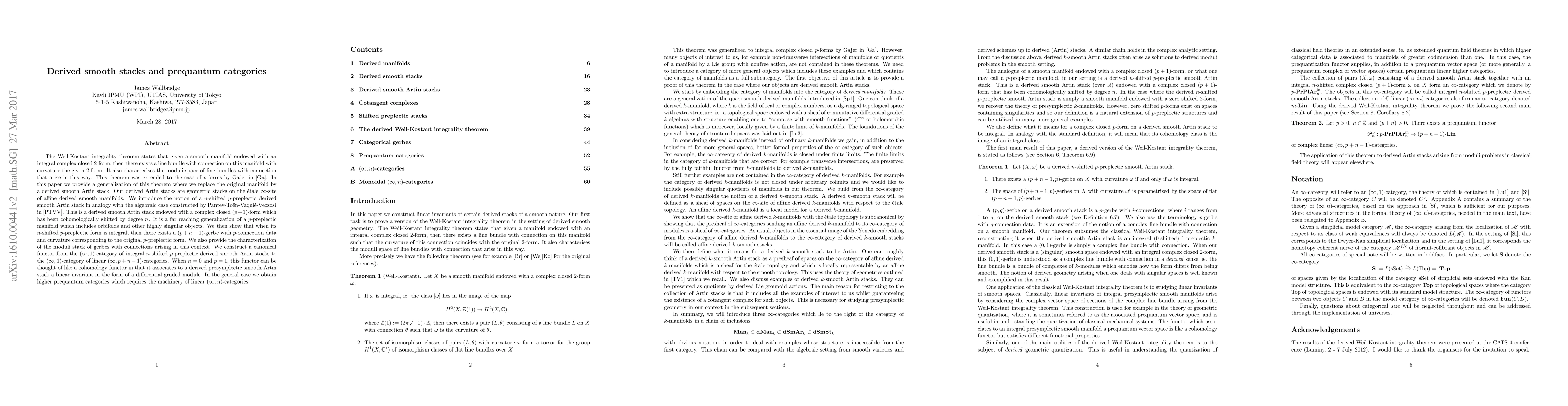 The Weil-Kostant integrality theorem states that given a smooth manifold endowed with an integral complex closed 2-form, then there exists a line bundle with connection on this manifold with curvature the given 2-form. It also characterises the moduli space of line bundles with connection that arise in this way. This theorem was extended to the case of p-forms by Gajer in [Ga]. In this paper we provide a generalization of this theorem where we replace the original manifold by a derived smooth Artin stack. Our derived Artin stacks are geometric stacks on the \'etale (\infty,1)-site of affine derived smooth manifolds. We introduce the notion of a n-shifted p-preplectic derived smooth Artin stack in analogy with the algebraic case constructed by Pantev-To\"en-Vaqui\'e-Vezzosi in [PTVV]. This is a derived smooth Artin stack endowed with a complex closed (p+1)-form which has been cohomologically shifted by degree n. It is a far reaching generalization of a p-preplectic manifold which includes orbifolds and other highly singular objects. We then show that when its n-shifted p-preplectic form is integral, then there exists a (p+n-1)-gerbe with p-connection data and curvature corresponding to the original p-preplectic form. We also provide the characterization of the moduli stack of gerbes with connections arising in this context. We construct a canonical functor from the (\infty,1)-category of integral n-shifted p-preplectic derived smooth Artin stacks to the (\infty,1)-category of linear (\infty,p+n-1)-categories. When n=0 and p=1, this functor can be thought of like a cohomology functor in that it associates to a derived presymplectic smooth Artin stack a linear invariant in the form of a differential graded module. In the general case we obtain higher prequantum categories which requires the machinery of linear (\infty,n)-categories.