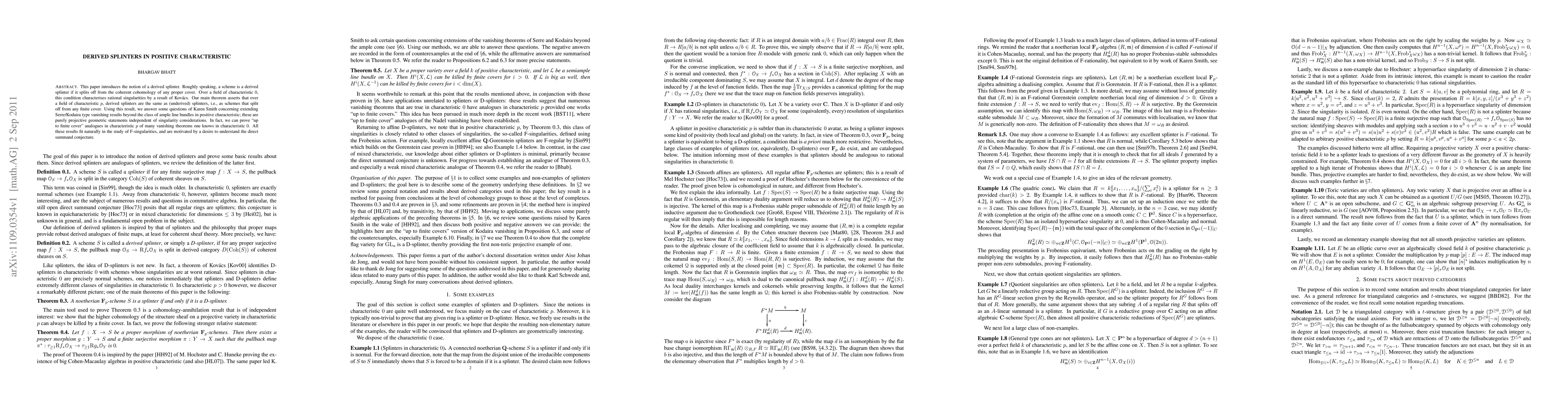 The paper introduces the concept of derived splinters, extending the notion of splinters in characteristic zero to positive characteristic. It establishes a main theorem equating derived splinters with underived splinters in positive characteristic.