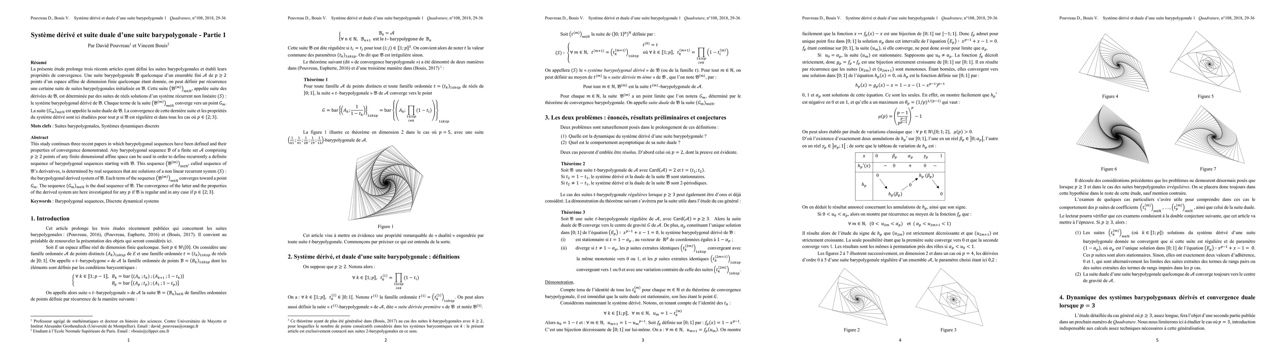 This study continues three recent papers in which barypolygonal sequences have been defined and their properties of convergence demonstrated. Any barypolygonal sequence $\mathcal{B}$ of a finite set $\mathcal{A}$ comprising $p\ge 2$ points of any finite dimensional affine space can be used in order to define recurrently a definite sequence of barypolygonal sequences starting with $\mathcal{B}$. This sequence $(\mathcal{B}^{(m)})_{M\in N}$, called sequence of B's derivatives, is determined by real sequences that are solutions of a non linear recurrent system $(S)$: the barypolygonal derived system of $\mathcal{B}$. Each term of the sequence $(\mathcal{B}^{(m)})_{M\in N}$ converges toward a point $G_m$. The sequence $(G_m )_{m\in N}$ is the dual sequence of B. The convergence of the latter and the properties of the derived system are here investigated for any $p$ if $\mathcal{B}$ is regular and in any case if $p\in{2;3}$.