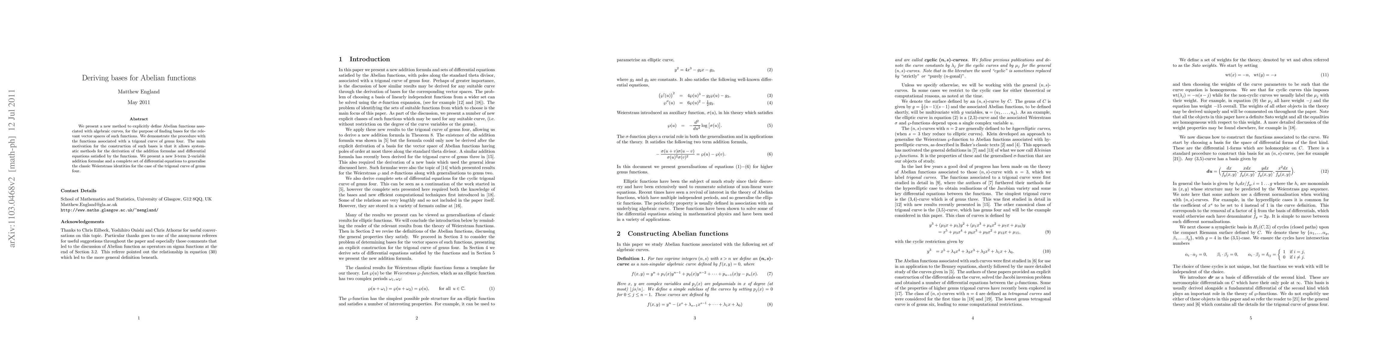 We present a new method to explicitly define Abelian functions associated with algebraic curves, for the purpose of finding bases for the relevant vector spaces of such functions. We demonstrate the procedure with the functions associated with a trigonal curve of genus four. The main motivation for the construction of such bases is that it allows systematic methods for the derivation of the addition formulae and differential equations satisfied by the functions. We present a new 3-term 2-variable addition formulae and a complete set of differential equations to generalise the classic Weierstrass identities for the case of the trigonal curve of genus four.