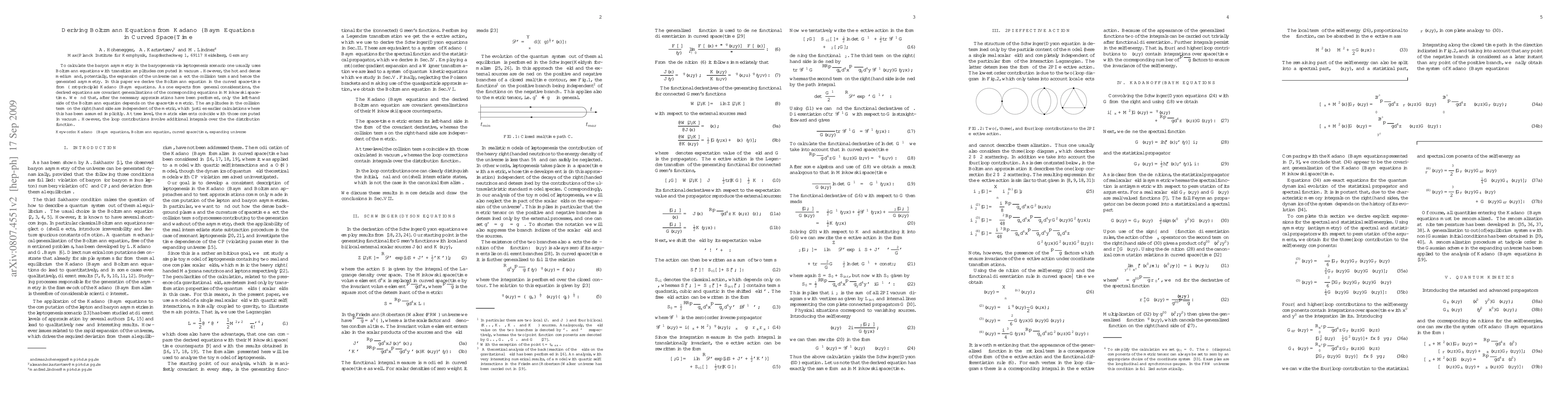 To calculate the baryon asymmetry in the baryogenesis via leptogenesis scenario one usually uses Boltzmann equations with transition amplitudes computed in vacuum. However, the hot and dense medium and, potentially, the expansion of the universe can affect the collision terms and hence the generated asymmetry. In this paper we derive the Boltzmann equation in the curved space-time from (first-principle) Kadanoff-Baym equations. As one expects from general considerations, the derived equations are covariant generalizations of the corresponding equations in Minkowski space-time. We find that, after the necessary approximations have been performed, only the left-hand side of the Boltzmann equation depends on the space-time metric. The amplitudes in the collision term on the right--hand side are independent of the metric, which justifies earlier calculations where this has been assumed implicitly. At tree level, the matrix elements coincide with those computed in vacuum. However, the loop contributions involve additional integrals over the the distribution function.