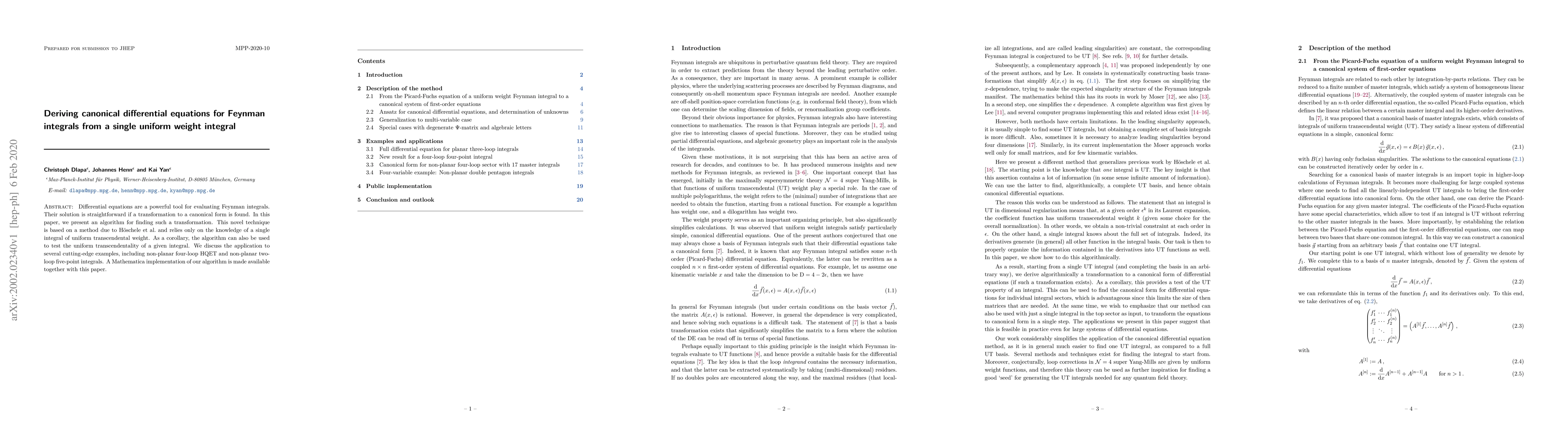 This paper introduces an algorithm for transforming Feynman integrals into a canonical form using a single uniform weight integral, simplifying their evaluation via differential equations. The method, based on Hoschele et al.'s work, also tests the uniform transcendentality of integrals and is demonstrated on advanced examples like non-planar four-loop HQET and non-planar two-loop five-point integrals.