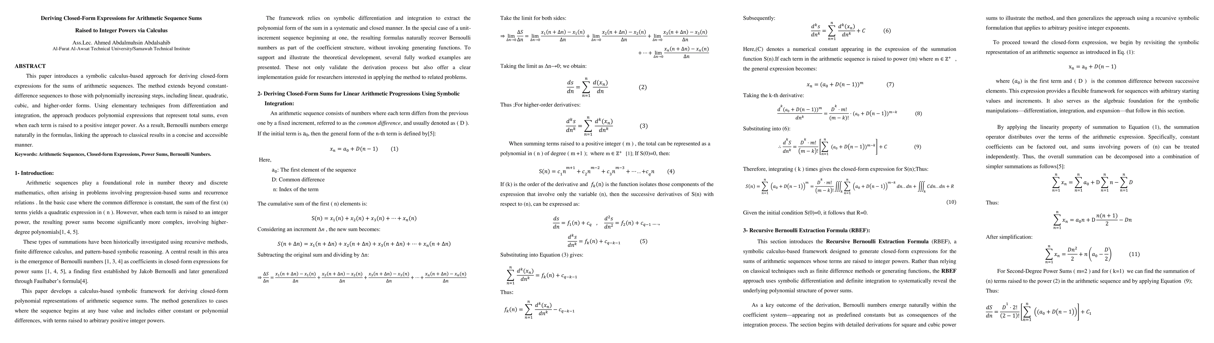 This paper introduces a symbolic calculus-based approach for deriving closed-form expressions for the sums of arithmetic sequences. The method extends beyond constant-difference sequences to those with polynomially increasing steps, including linear, quadratic, cubic, and higher-order forms. Using elementary techniques from differentiation and integration, the approach produces polynomial expressions that represent total sums, even when each term is raised to a positive integer power. As a result, Bernoulli numbers emerge naturally in the formulas, linking the approach to classical results in a concise and accessible manner.