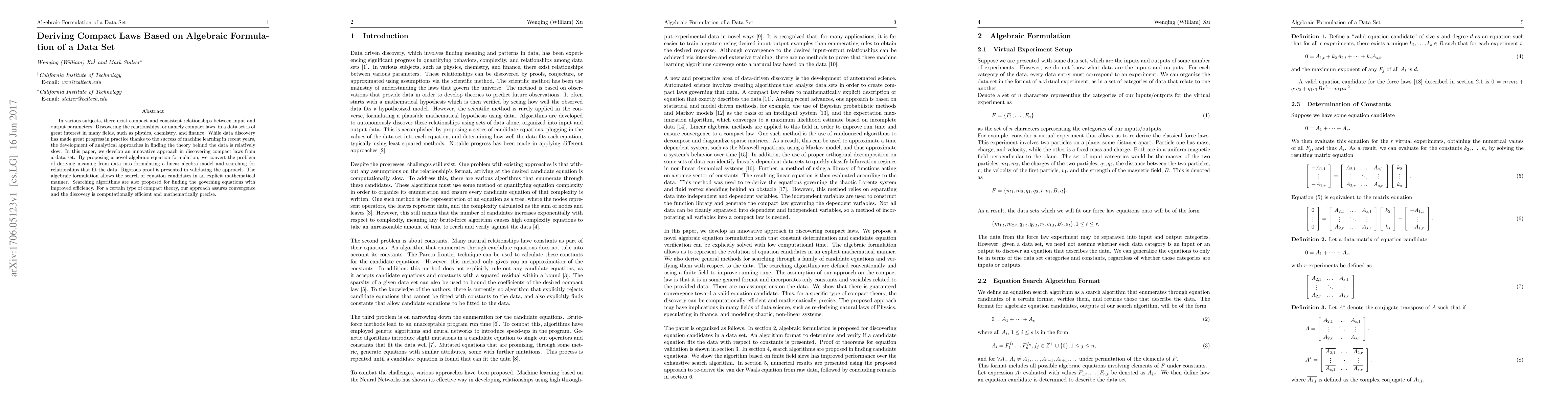 In various subjects, there exist compact and consistent relationships between input and output parameters. Discovering the relationships, or namely compact laws, in a data set is of great interest in many fields, such as physics, chemistry, and finance. While data discovery has made great progress in practice thanks to the success of machine learning in recent years, the development of analytical approaches in finding the theory behind the data is relatively slow. In this paper, we develop an innovative approach in discovering compact laws from a data set. By proposing a novel algebraic equation formulation, we convert the problem of deriving meaning from data into formulating a linear algebra model and searching for relationships that fit the data. Rigorous proof is presented in validating the approach. The algebraic formulation allows the search of equation candidates in an explicit mathematical manner. Searching algorithms are also proposed for finding the governing equations with improved efficiency. For a certain type of compact theory, our approach assures convergence and the discovery is computationally efficient and mathematically precise.