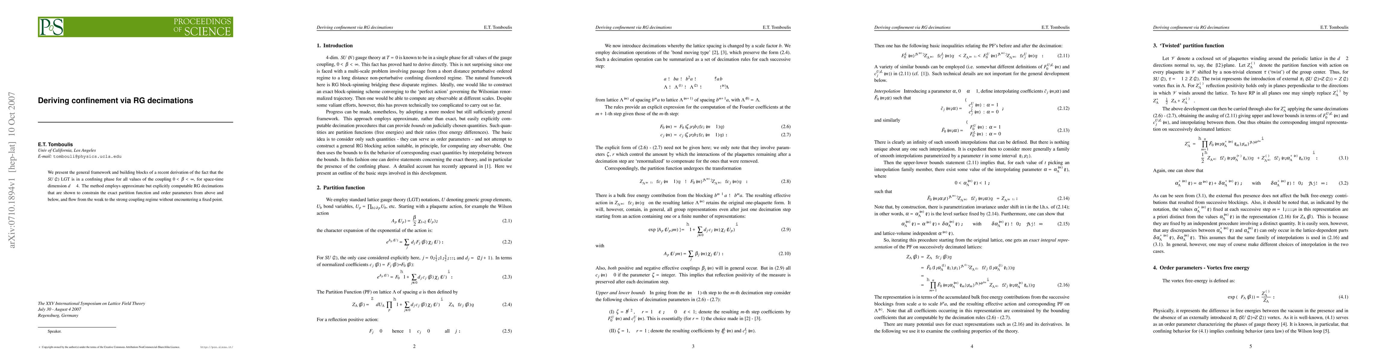 We present the general framework and building blocks of a recent derivation of the fact that the SU(2) LGT is in a confining phase for all values of the coupling $0 < \beta < \infty$, for space-time dimension $d \leq 4$. The method employs approximate but explicitly computable RG decimations that are shown to constrain the exact partition function and order parameters from above and below, and flow from the weak to the strong coupling regime without encountering a fixed point.