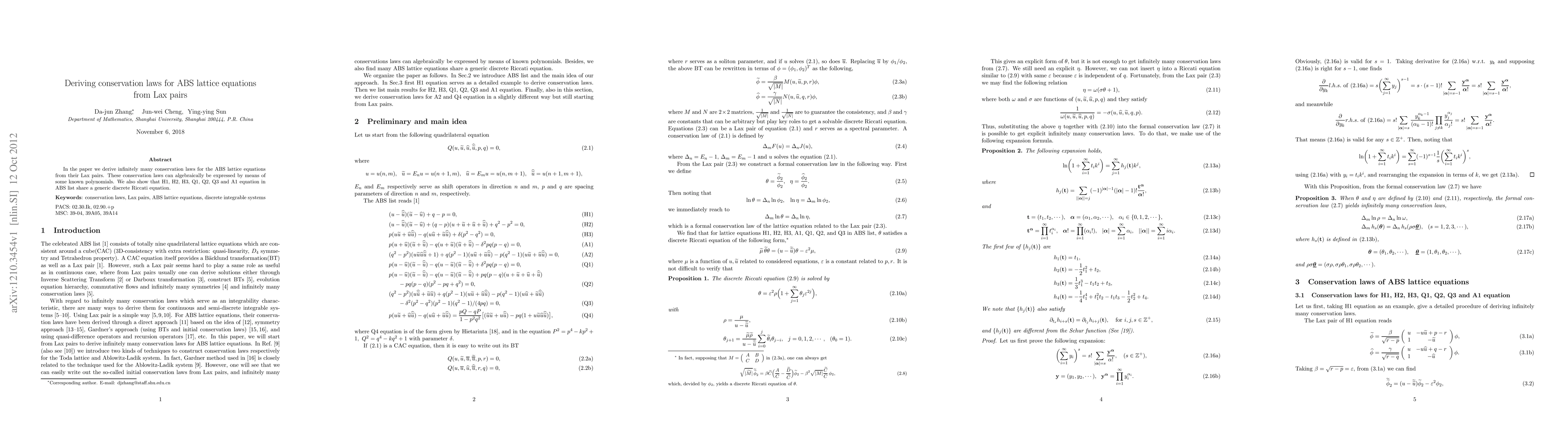 This paper derives infinitely many conservation laws for ABS lattice equations from their Lax pairs, expressing them using known polynomials, and demonstrates a shared generic discrete Riccati equation among H1, H2, H3, Q1, Q2, Q3, and A1 equations in the ABS list.