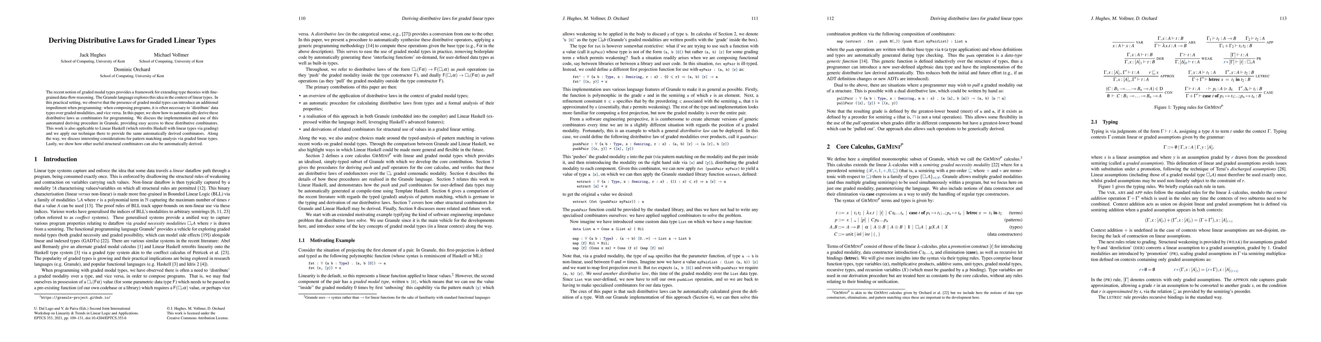 This paper presents a method for automatically deriving distributive laws for graded linear types in the Granule language, enabling finer-grained data-flow reasoning. It also applies these techniques to Linear Haskell, providing practical tools for programmers to manage complex type compositions.