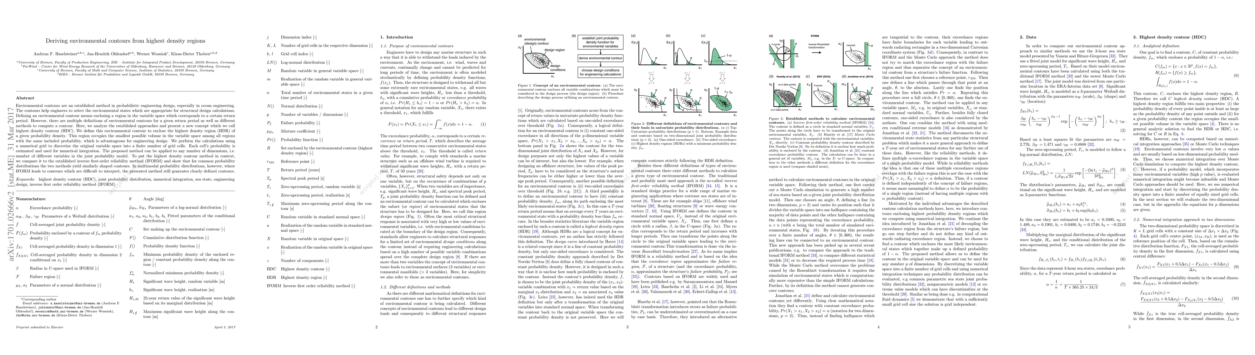 This paper introduces a new method called highest density contour (HDC) to define environmental contours in probabilistic engineering design, particularly in ocean engineering. Unlike traditional methods, HDC encloses the highest density region of a given probability density, offering a more compact and advantageous volume for design calculations. The method is compared to the inverse first-order reliability method (IFORM), showing better interpretability in multimodal distributions.