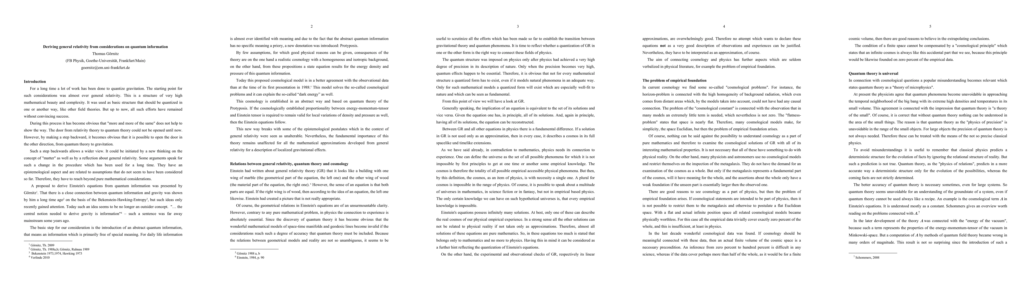 From a theory of an abstract quantum information the theory of general relativity can be deduced by means of few and physically good founded reasons. "Abstract" quantum information means that primarily no special meaning is connected with it. Therefore it is named with a new denotation: Protyposis. From the Protyposis and by using group-theoretical methods follows a cosmological model, which has an isotropic and homogeneous metric and solves the so-called cosmological problems. The Protyposis is subject to an equation of states for energy density and pressure that fulfils all the energy conditions and that also gives an explanation for the "dark energy". If it is demanded that the relations between spacetime structure and the material content should remain valid for variations from this ideal cosmology, then general relativity results from this quantum theoretical considerations as a description for local inhomogenities.