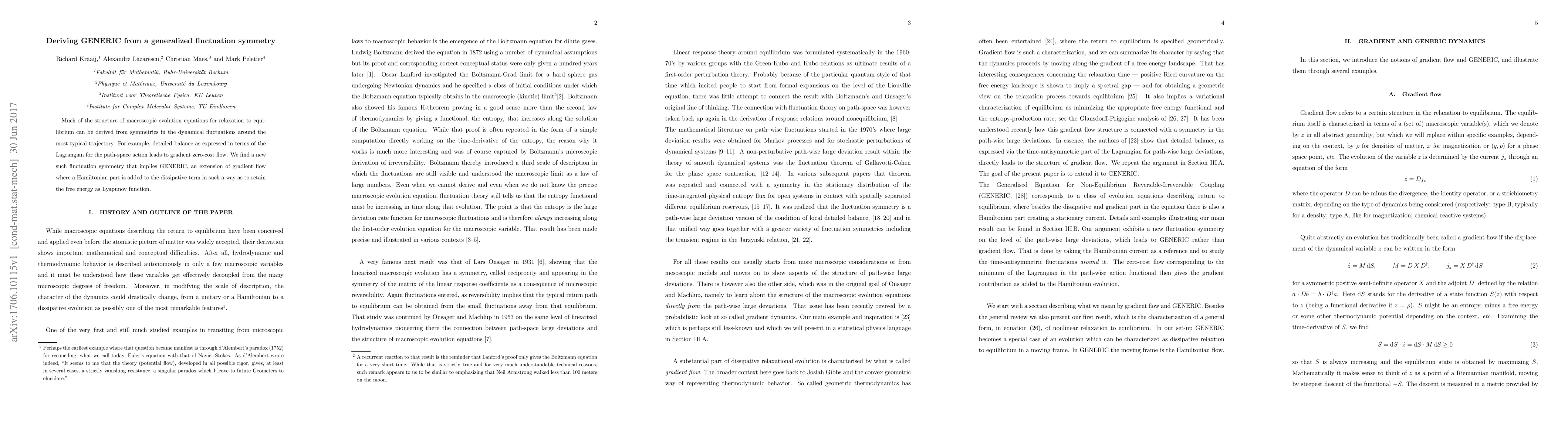 Much of the structure of macroscopic evolution equations for relaxation to equilibrium can be derived from symmetries in the dynamical fluctuations around the most typical trajectory. For example, detailed balance as expressed in terms of the Lagrangian for the path-space action leads to gradient zero-cost flow. We find a new such fluctuation symmetry that implies GENERIC, an extension of gradient flow where a Hamiltonian part is added to the dissipative term in such a way as to retain the free energy as Lyapunov function.