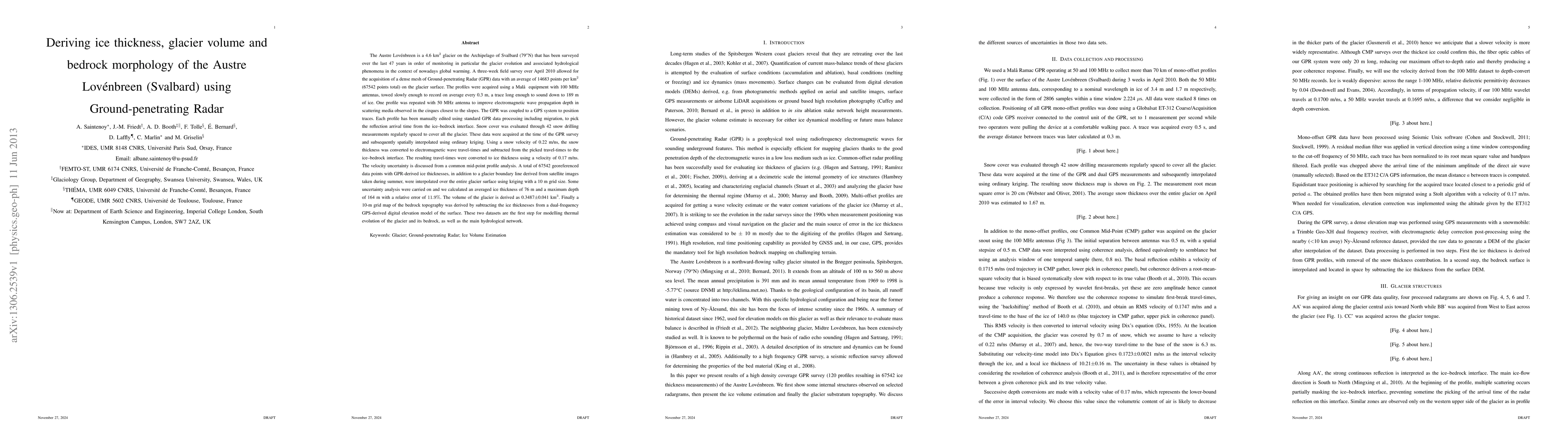 This study uses Ground-penetrating Radar (GPR) data to derive ice thickness, glacier volume, and bedrock morphology for Austre Lov'enbreen in Svalbard. The GPR survey, coupled with GPS and snow drilling measurements, yielded an average ice thickness of 76 m and a maximum depth of 164 m, with a calculated glacier volume of 0.3487 km³. The bedrock topography map provides foundational data for future thermal and hydrological models.