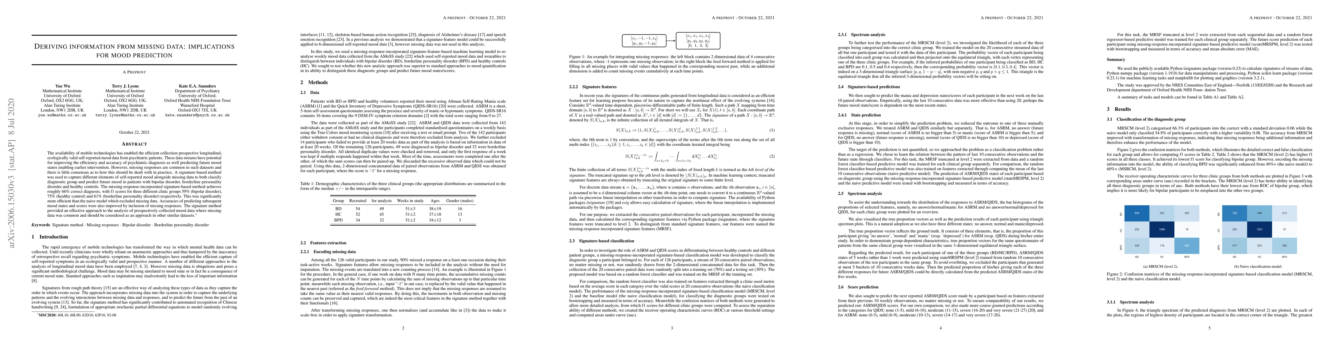 The availability of mobile technologies has enabled the efficient collection prospective longitudinal, ecologically valid self-reported mood data from psychiatric patients. These data streams have potential for improving the efficiency and accuracy of psychiatric diagnosis as well predicting future mood states enabling earlier intervention. However, missing responses are common in such datasets and there is little consensus as to how this should be dealt with in practice. A signature-based method was used to capture different elements of self-reported mood alongside missing data to both classify diagnostic group and predict future mood in patients with bipolar disorder, borderline personality disorder and healthy controls. The missing-response-incorporated signature-based method achieves roughly 66\% correct diagnosis, with f1 scores for three different clinic groups 59\% (bipolar disorder), 75\% (healthy control) and 61\% (borderline personality disorder) respectively. This was significantly more efficient than the naive model which excluded missing data. Accuracies of predicting subsequent mood states and scores were also improved by inclusion of missing responses. The signature method provided an effective approach to the analysis of prospectively collected mood data where missing data was common and should be considered as an approach in other similar datasets.