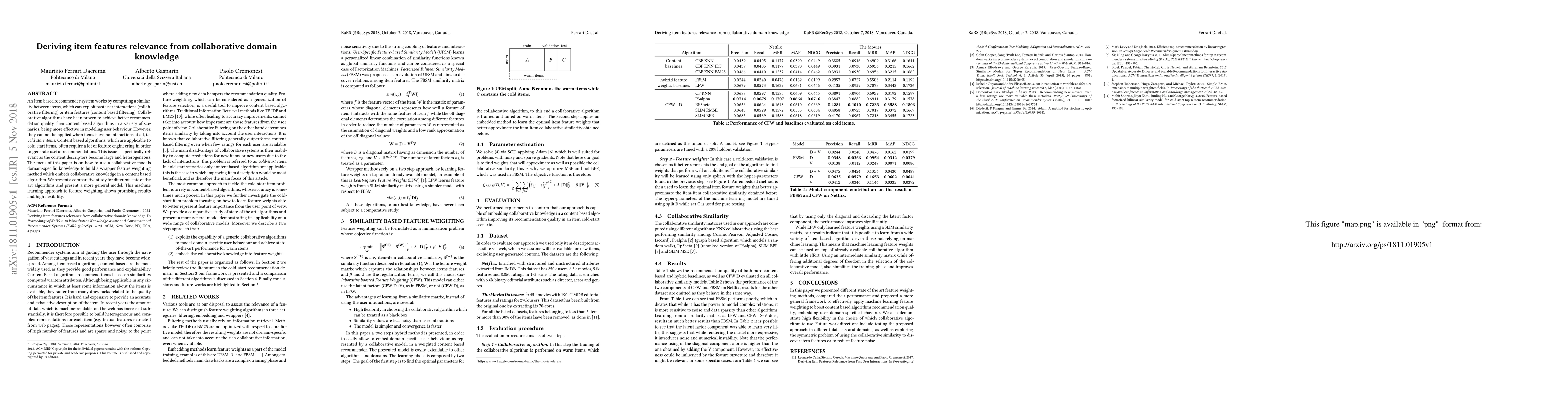 An Item based recommender system works by computing a similarity between items, which can exploit past user interactions (collaborative filtering) or item features (content based filtering). Collaborative algorithms have been proven to achieve better recommendation quality then content based algorithms in a variety of scenarios, being more effective in modeling user behaviour. However, they can not be applied when items have no interactions at all, i.e. cold start items. Content based algorithms, which are applicable to cold start items, often require a lot of feature engineering in order to generate useful recommendations. This issue is specifically relevant as the content descriptors become large and heterogeneous. The focus of this paper is on how to use a collaborative models domain-specific knowledge to build a wrapper feature weighting method which embeds collaborative knowledge in a content based algorithm. We present a comparative study for different state of the art algorithms and present a more general model. This machine learning approach to feature weighting shows promising results and high flexibility.