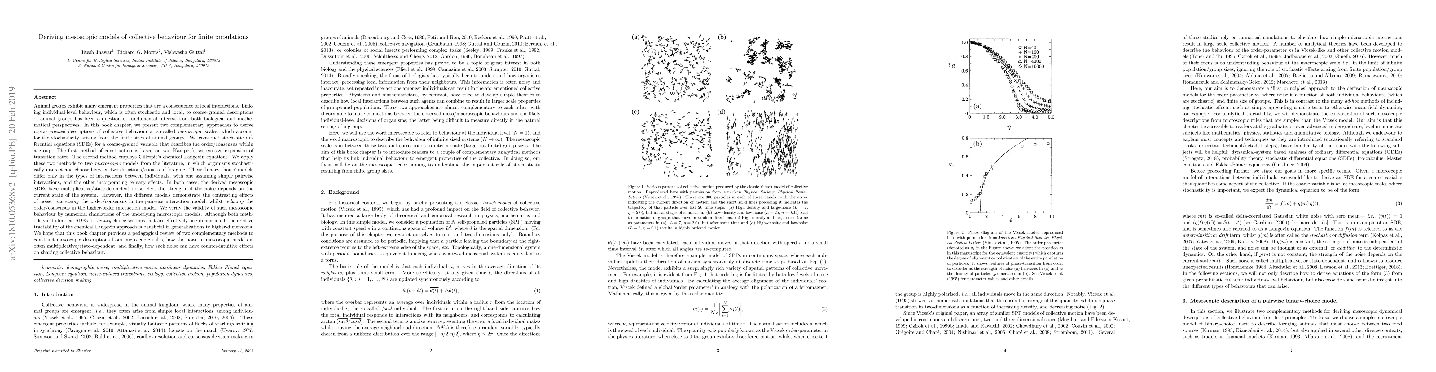 Animal groups exhibit emergent properties that are a consequence of local interactions. Linking individual-level behaviour to coarse-grained descriptions of animal groups has been a question of fundamental interest. Here, we present two complementary approaches to deriving coarse-grained descriptions of collective behaviour at so-called mesoscopic scales, which account for the stochasticity arising from the finite sizes of animal groups. We construct stochastic differential equations (SDEs) for a coarse-grained variable that describes the order/consensus within a group. The first method of construction is based on van Kampen's system-size expansion of transition rates. The second method employs Gillespie's chemical Langevin equations. We apply these two methods to two microscopic models from the literature, in which organisms stochastically interact and choose between two directions/choices of foraging. These `binary-choice' models differ only in the types of interactions between individuals, with one assuming simple pair-wise interactions, and the other incorporating higher-order effects. In both cases, the derived mesoscopic SDEs have multiplicative, or state-dependent, noise. However, the different models demonstrate the contrasting effects of noise: increasing order in the pair-wise interaction model, whilst reducing order in the higher-order interaction model. Although both methods yield identical SDEs for such binary-choice, or one-dimensional, systems, the relative tractability of the chemical Langevin approach is beneficial in generalizations to higher-dimensions. In summary, this book chapter provides a pedagogical review of two complementary methods to construct mesoscopic descriptions from microscopic rules and demonstrates how resultant multiplicative noise can have counter-intuitive effects on shaping collective behaviour.