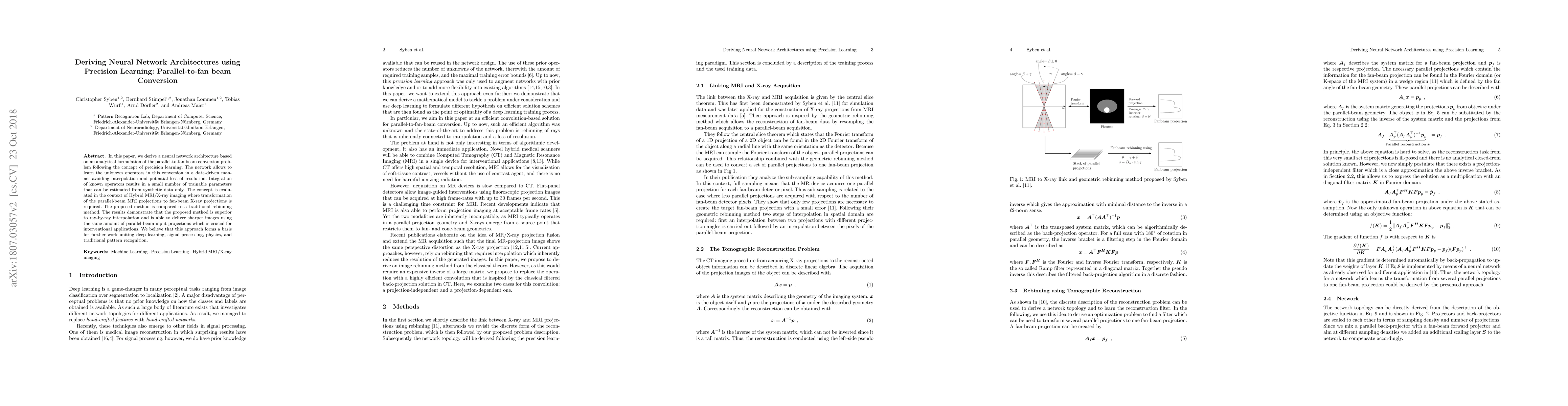 In this paper, we derive a neural network architecture based on an analytical formulation of the parallel-to-fan beam conversion problem following the concept of precision learning. The network allows to learn the unknown operators in this conversion in a data-driven manner avoiding interpolation and potential loss of resolution. Integration of known operators results in a small number of trainable parameters that can be estimated from synthetic data only. The concept is evaluated in the context of Hybrid MRI/X-ray imaging where transformation of the parallel-beam MRI projections to fan-beam X-ray projections is required. The proposed method is compared to a traditional rebinning method. The results demonstrate that the proposed method is superior to ray-by-ray interpolation and is able to deliver sharper images using the same amount of parallel-beam input projections which is crucial for interventional applications. We believe that this approach forms a basis for further work uniting deep learning, signal processing, physics, and traditional pattern recognition.