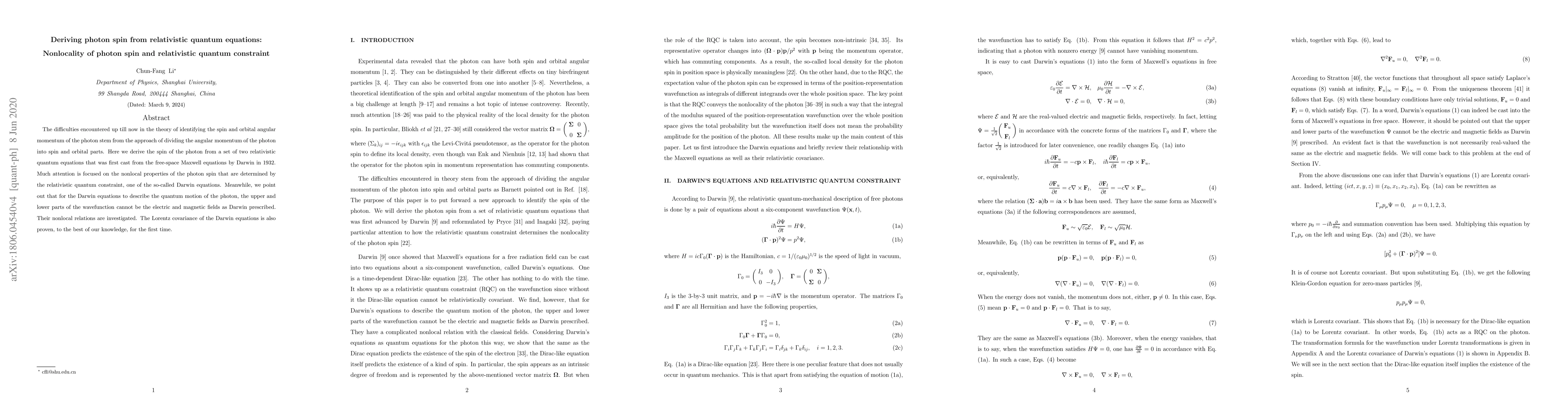 This paper derives the photon spin from relativistic quantum equations, specifically the Darwin equations, and explores the nonlocal properties of photon spin determined by these equations. It also investigates the nonlocal relations between the upper and lower parts of the wavefunction and proves the Lorentz covariance of the Darwin equations for the first time.